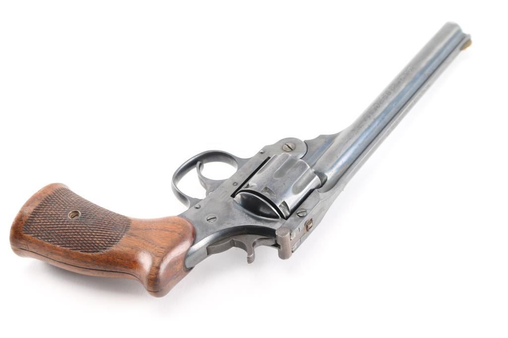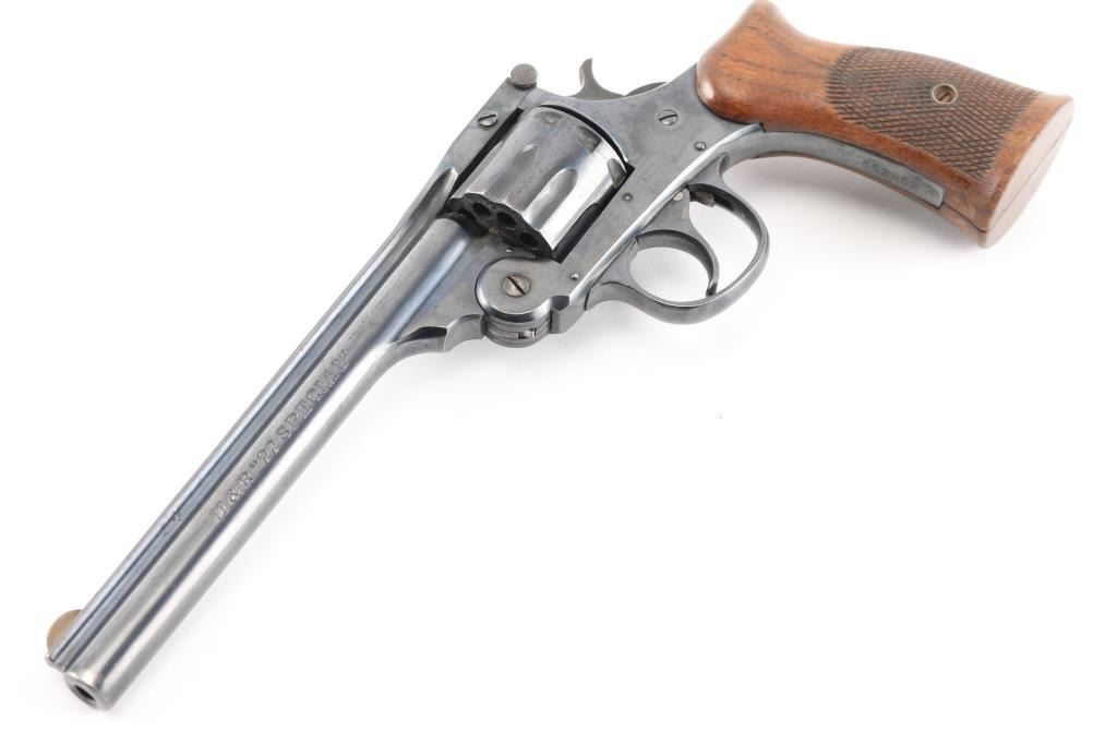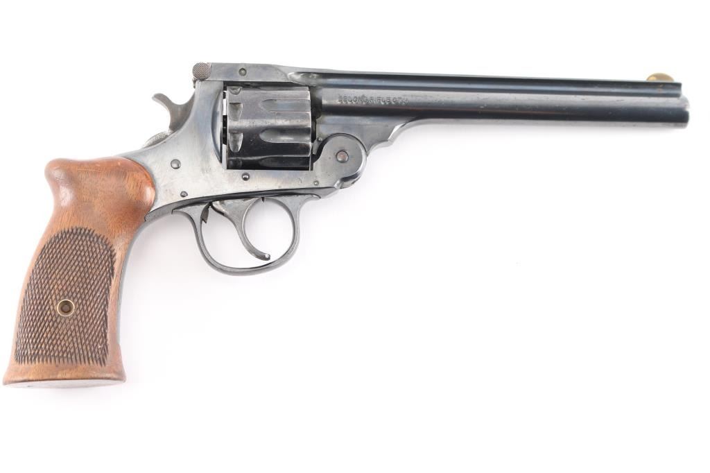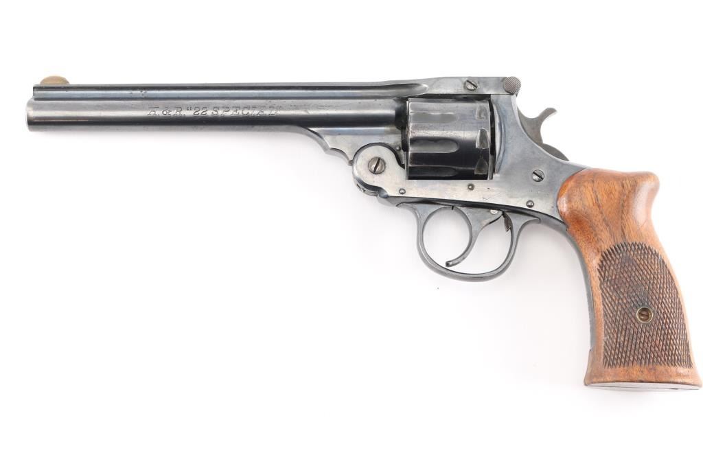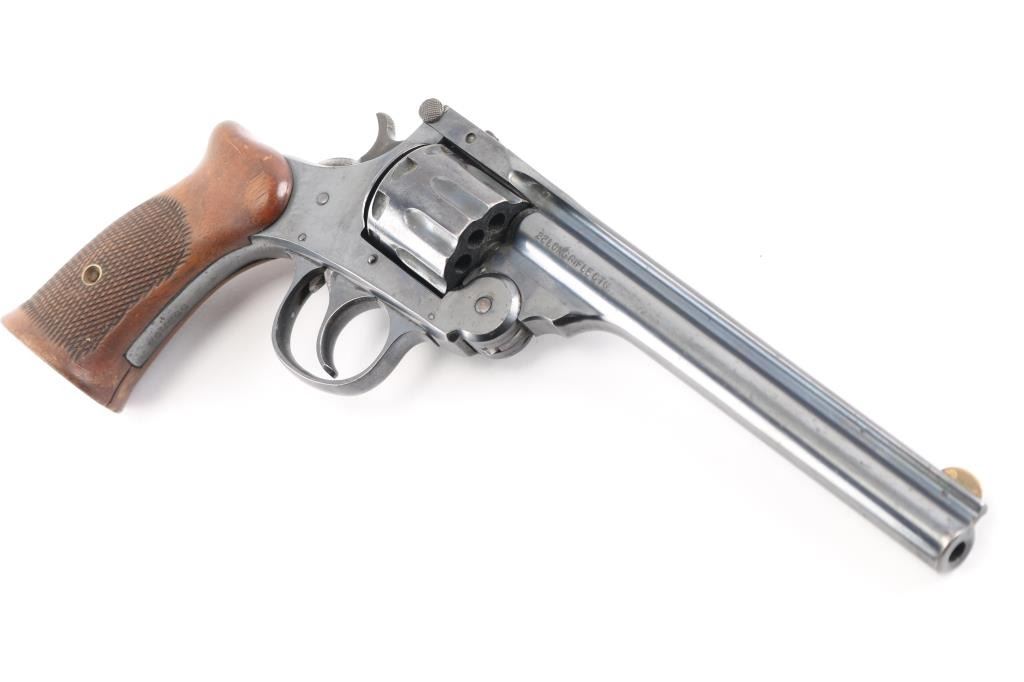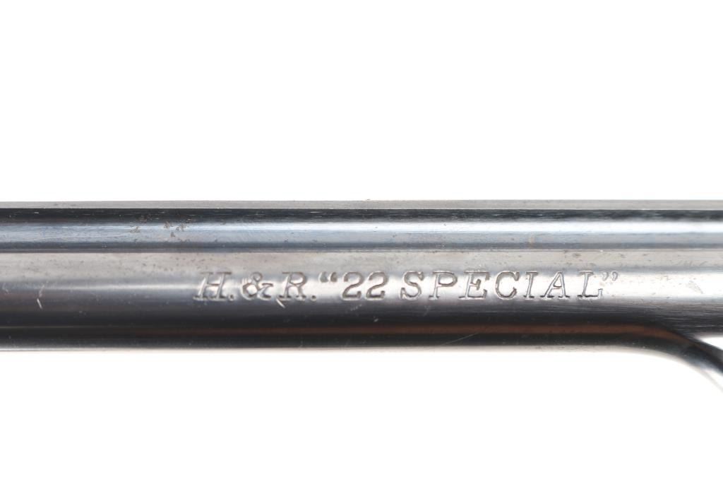 Harrington & Richardson Arms "22 Special" break-top, 9 Shot .22LR Revolver. 6: barrel with sighting rib, brass front sight blade, which would date it to 1930-32, manufactured 1925-42. Two piece checkered walnut grips, short knurled hammer spur, serrated trigger. Barrel locks up tight, grips are very good, blue is about 85% with muzzle wear, minor scratches, and handling/edge wear, bore appears excellent/bright, strong rifling. These are known as very accurate revolvers. Matching serial numbers.