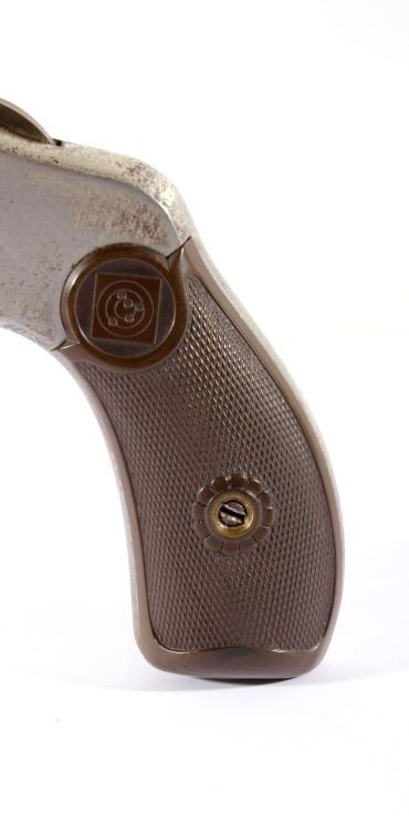 For your consideration is an Harrington & Richardson .32 S&W top break automatic ejecting revolver. This revolver features a patina'd nickel finish, top break operation and is a double action with a six shot cylinder. The hard plastic grips are brown in color and in good condition. The revolver is marked in numerous places, reading HARRINGTON & RICHARDSON ARMS COMPANY - WORCHESTER MASS.U.S.A. PAT'D OCT. 4TH. 1887" on the top of the barrel rib. Matching serial numbers underneath the left grip panel, and partial matching serial numbers on the back of the cylinder, and extractor. The trigger does not engage that hammer on every pull and the extractor also does not function as intended. Serial Number: 8269. This firearm qualifies as a Curio & Relic Firearm, and requires FFL Transfer or NICS Background Check.