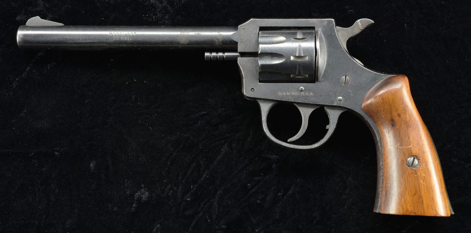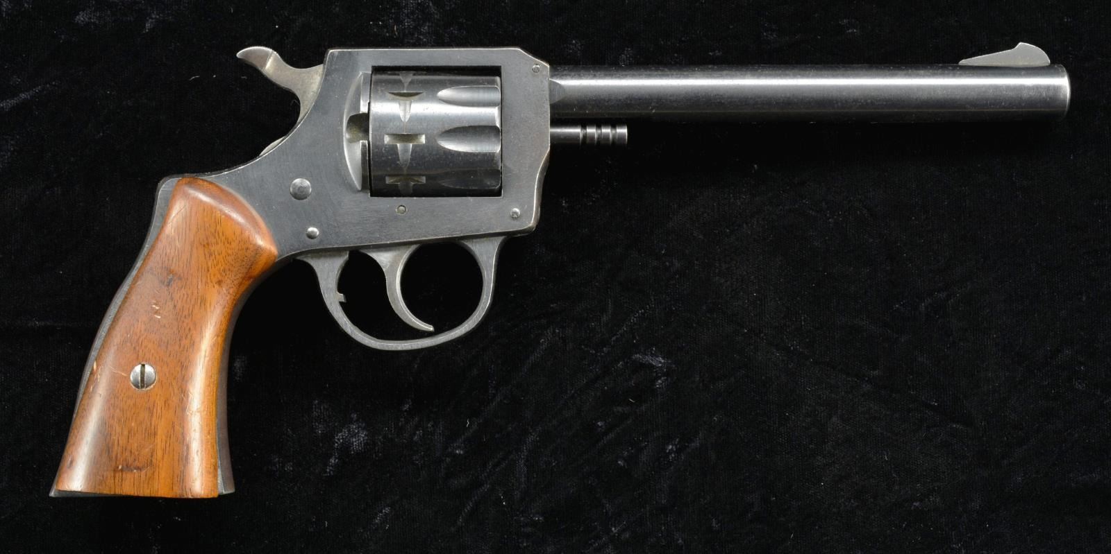 Cal. 22 LR. S# AD2957. Bbl. 6". Mfg. 1962-1973. Blued finish traditional DA 9 shot 22 LR revolver w/ removable cyl. Front blade & rear notched sights. 2 Piece hardwood grips. CONDITION: cyl. demonstrates excessive play which seems somewhat normal in these. Timing appears correct when cycling in SA though just a tad off in DA. Finish coverage is complete though the entirety is lightly speckled. Receiver is a bit proud of hardwood grips. Graying bore w/ decent rifling. PROVENANCE: Estate Collection of Jack Verret Sr. (22-875/JZ). MODERN. $100-200.
