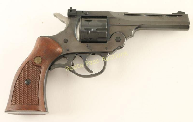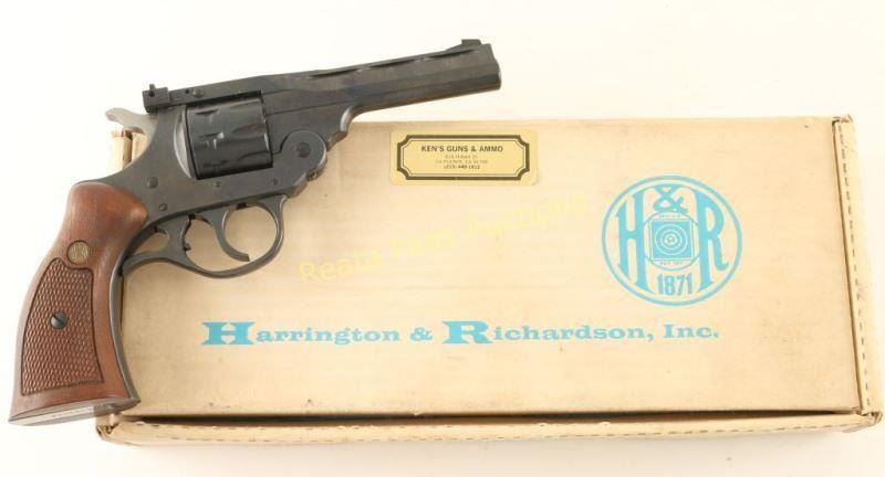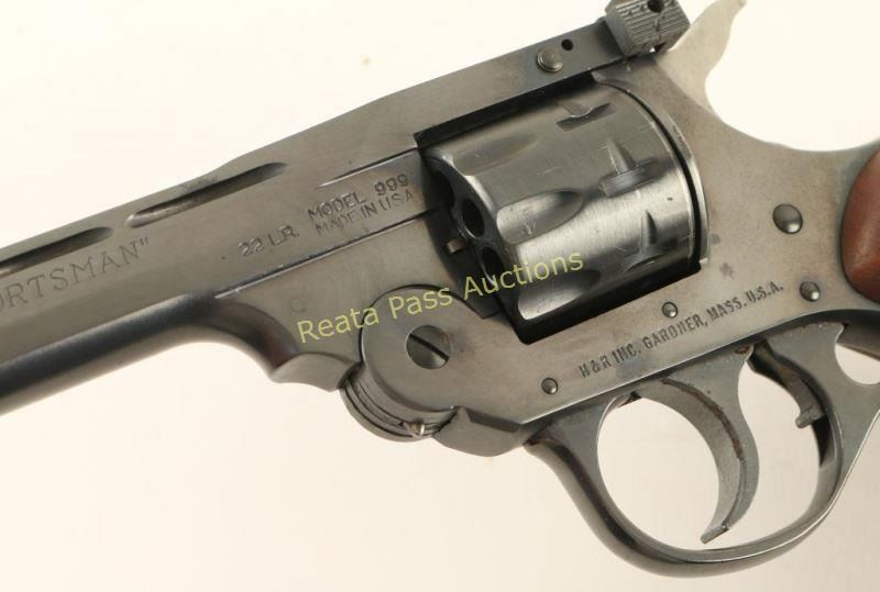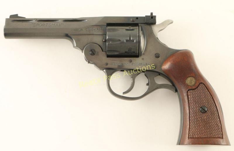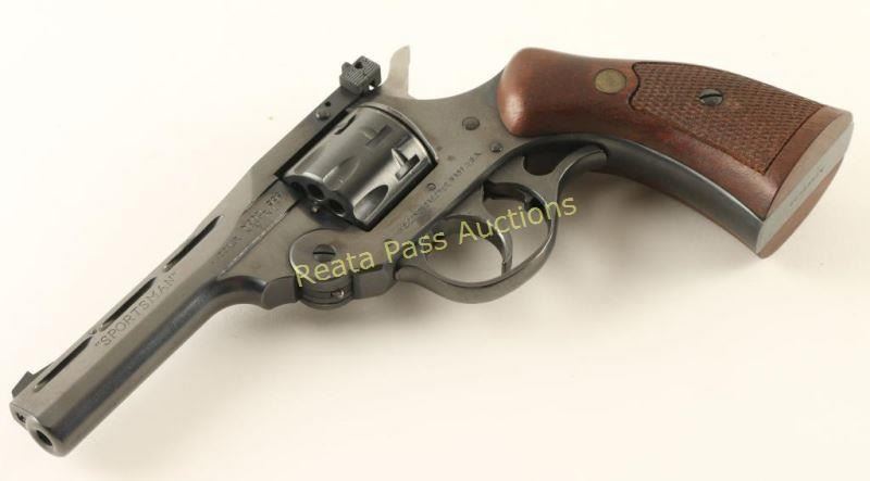 'Sportsman' Double action break-top revolver chambered in .22 Long Rifle. Features a blued finish, 4" ribbed barrel, pinned patridge front sight, adjustable rear window sight, fluted nine shot cylinder, beveled trigger, serrated hammer spur, and two piece H&R medallion checkered wood grips. Includes a factory cardboard box with documents. Revolver exhibits approximately 96% of it's original blued finish showing very little wear and some surface rust on the trigger and frame. Action functions well, bore is excellent and wood grips are fine. Condition is near excellent in box. ***Modern Firearm***