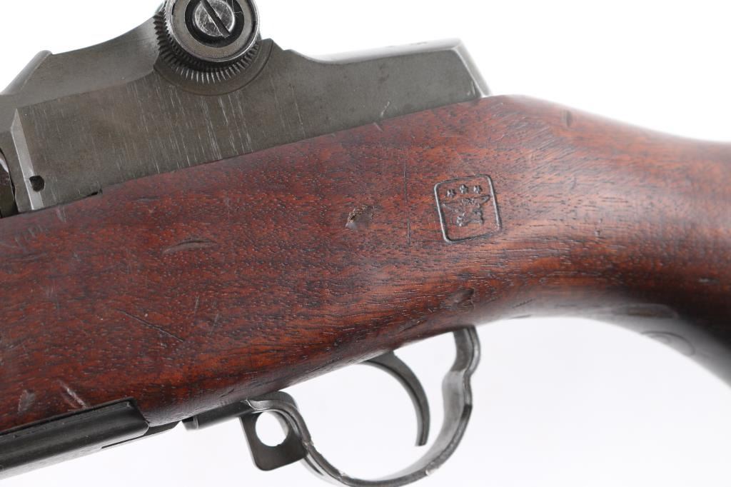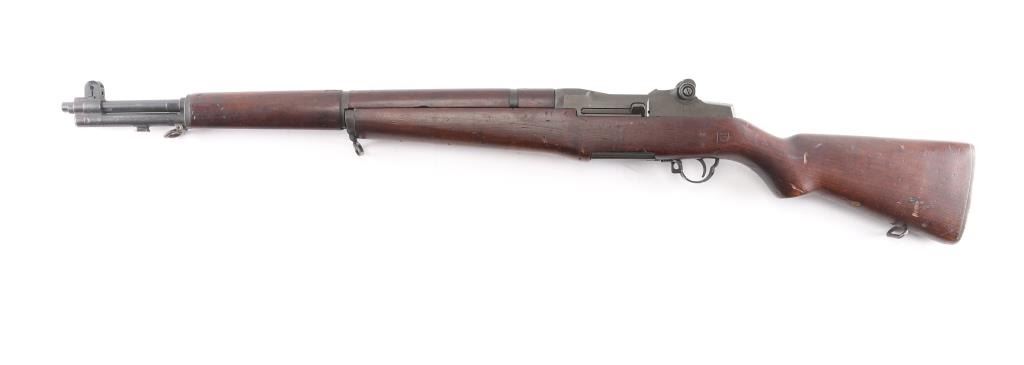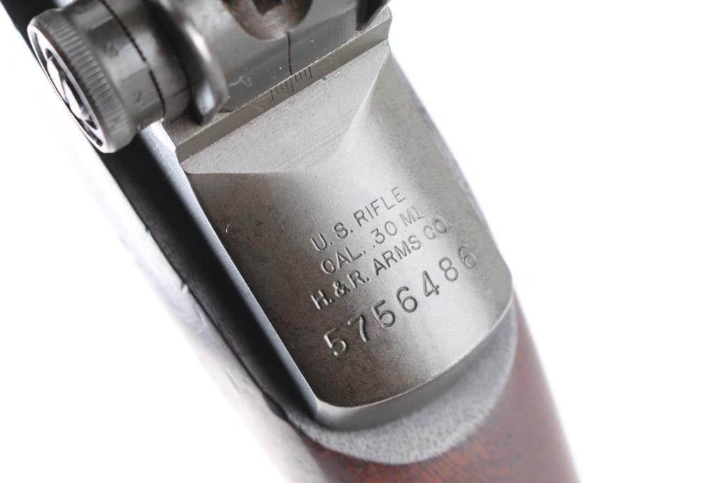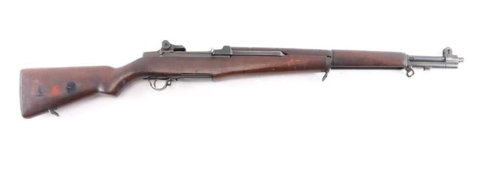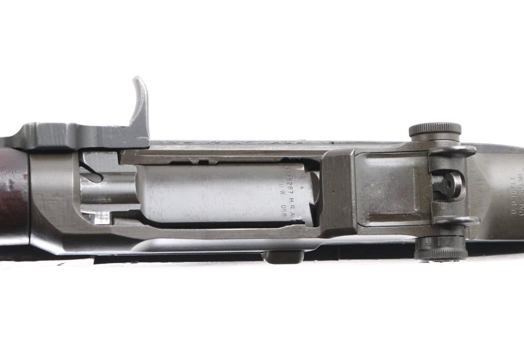 US military semi-automatic rifle, manufactured circa 1956. Features parkerized finish, wood stock & hand guards with a "P" in a circle stamped on the bottom of the stock grip, residual red and black paint on the right side of the shoulder stock, Department of Defense acceptance stamp on the left side of the stock above the trigger, metal butt stock cap with compartment, 24" barrel, adjustable sights with protected front blade & protected rear peep, manual safety. Trigger guard has stamped style trigger guard. Barrel marked "LMR D6535448 6 55 A42". Bolt marked "6528237 H.R.A. U.W. 058". Rear sight marked "HRA-W". Bore is very good with strong rifling, but dirty, finish is approximately 80% with some rust on the gas cylinder lock and around the front sight, contact wear on the bolt and receiver, edge wear due to use. Action is crisp/tight, and the wood is worn with some deep dents and scratches throughout. All markings are crisp/clear. Includes CMP Certificate and manual.