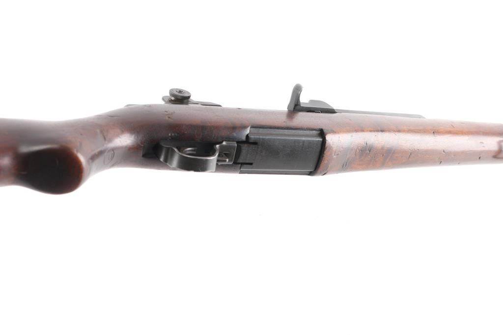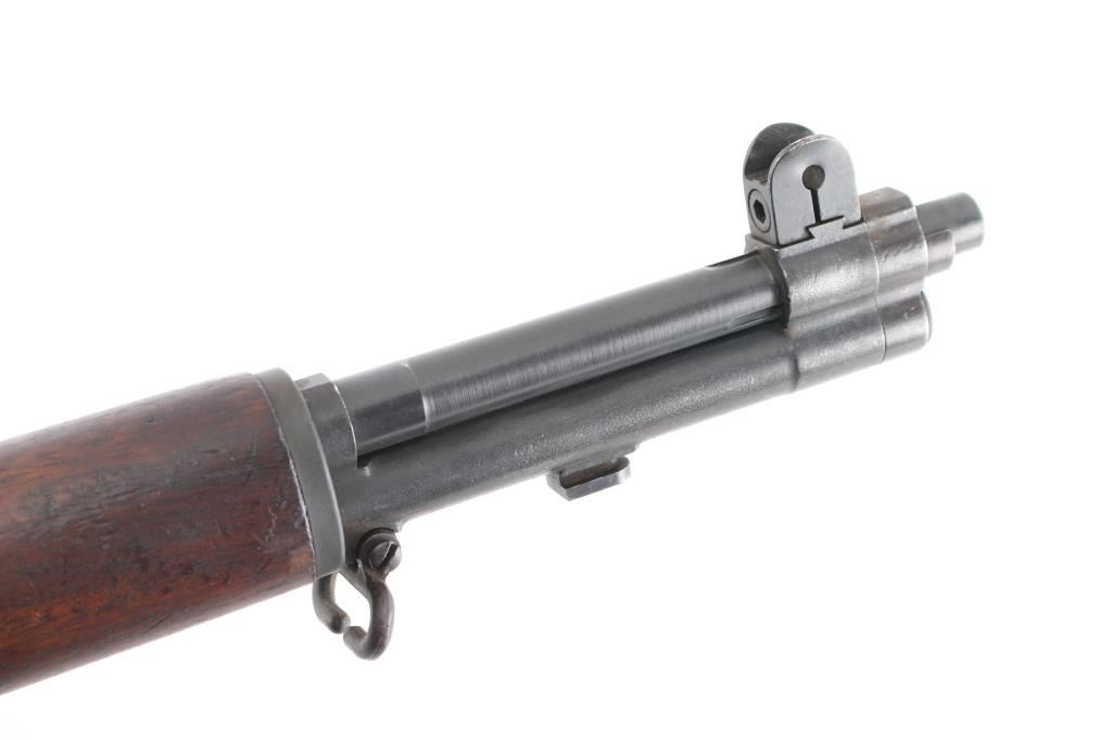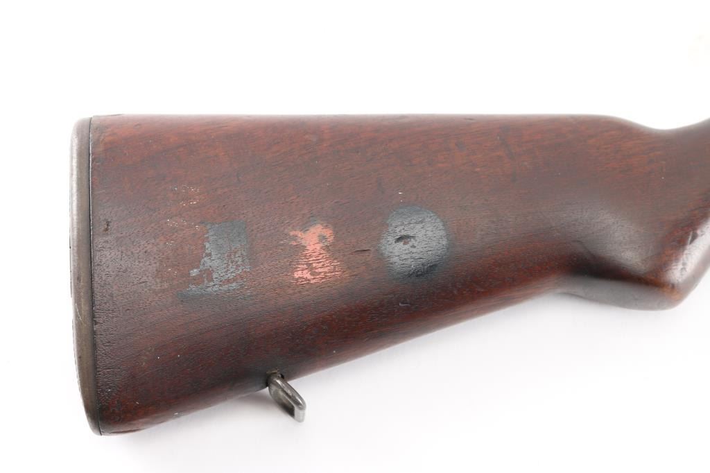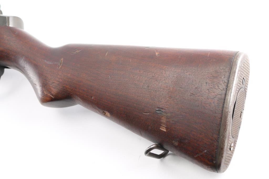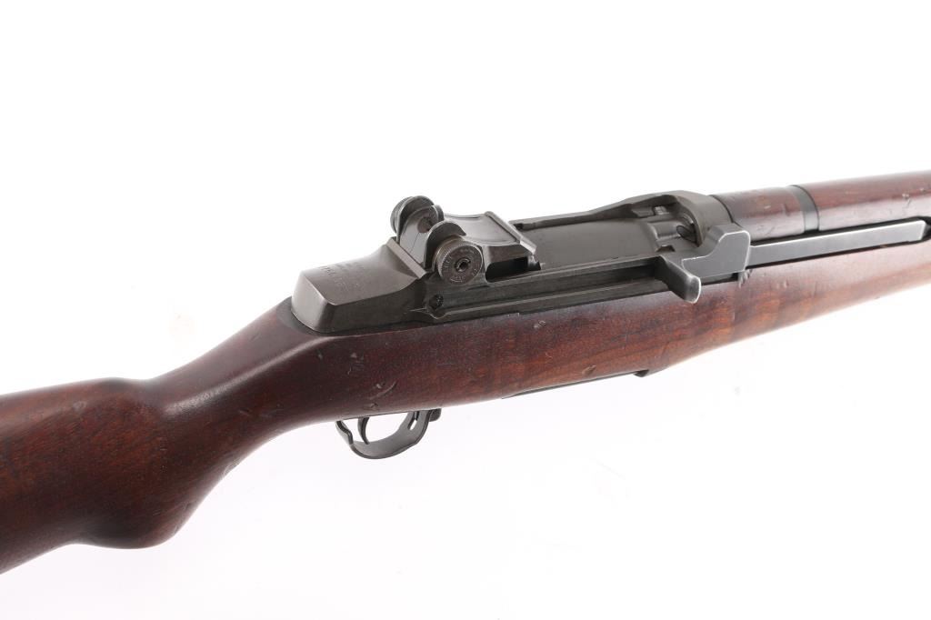 US military semi-automatic rifle, manufactured circa 1956. Features parkerized finish, wood stock & hand guards with a "P" in a circle stamped on the bottom of the stock grip, residual red and black paint on the right side of the shoulder stock, Department of Defense acceptance stamp on the left side of the stock above the trigger, metal butt stock cap with compartment, 24" barrel, adjustable sights with protected front blade & protected rear peep, manual safety. Trigger guard has stamped style trigger guard. Barrel marked "LMR D6535448 6 55 A42". Bolt marked "6528237 H.R.A. U.W. 058". Rear sight marked "HRA-W". Bore is very good with strong rifling, but dirty, finish is approximately 80% with some rust on the gas cylinder lock and around the front sight, contact wear on the bolt and receiver, edge wear due to use. Action is crisp/tight, and the wood is worn with some deep dents and scratches throughout. All markings are crisp/clear. Includes CMP Certificate and manual.