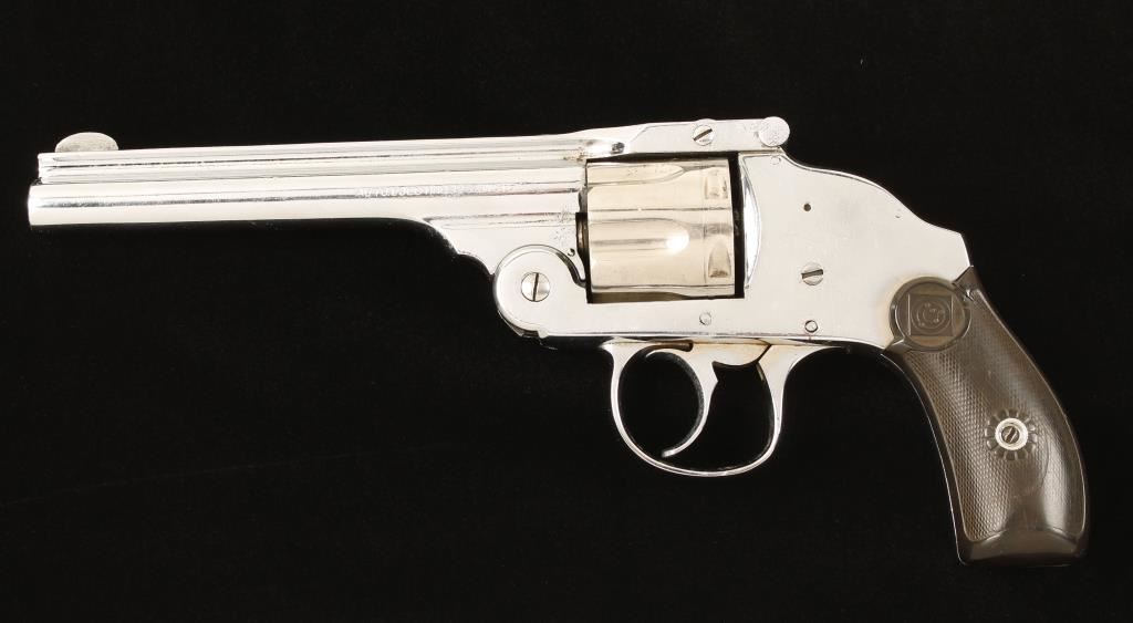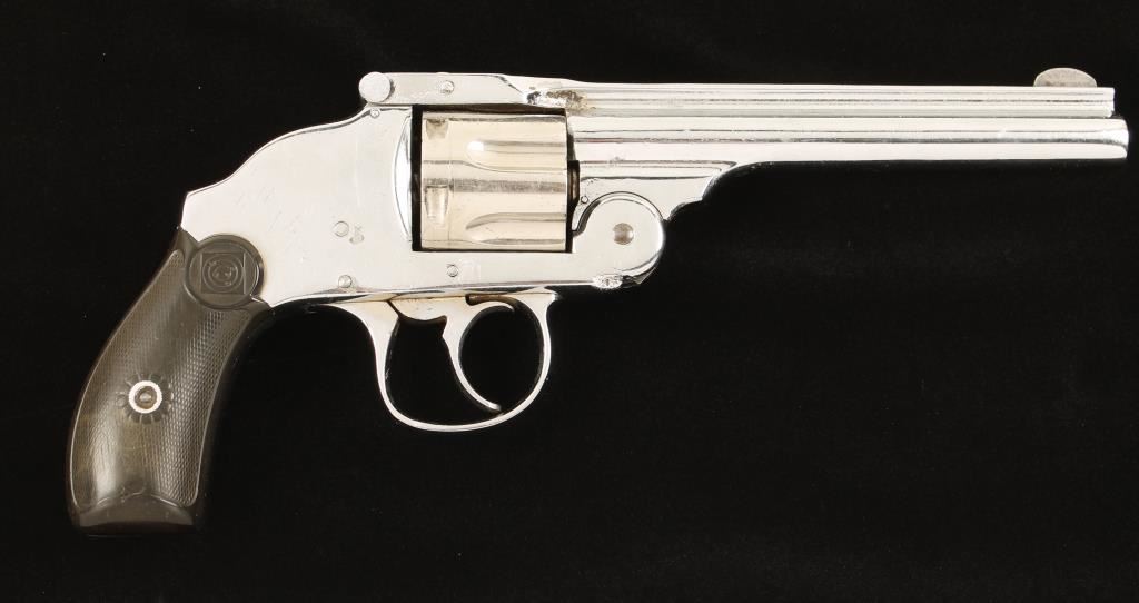 6 Shot Revolver, Nickel Plated, black Plastic Grips, 5" BBL. Condition: Fair as refinished, scratches, pitting and appears to have a heavy mar on the base of action. Action appears to function. Modern Firearm*