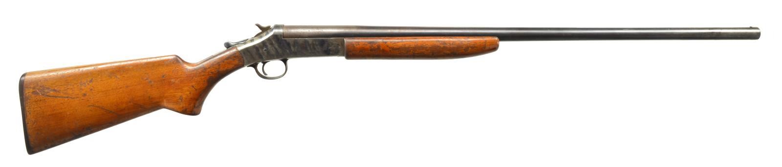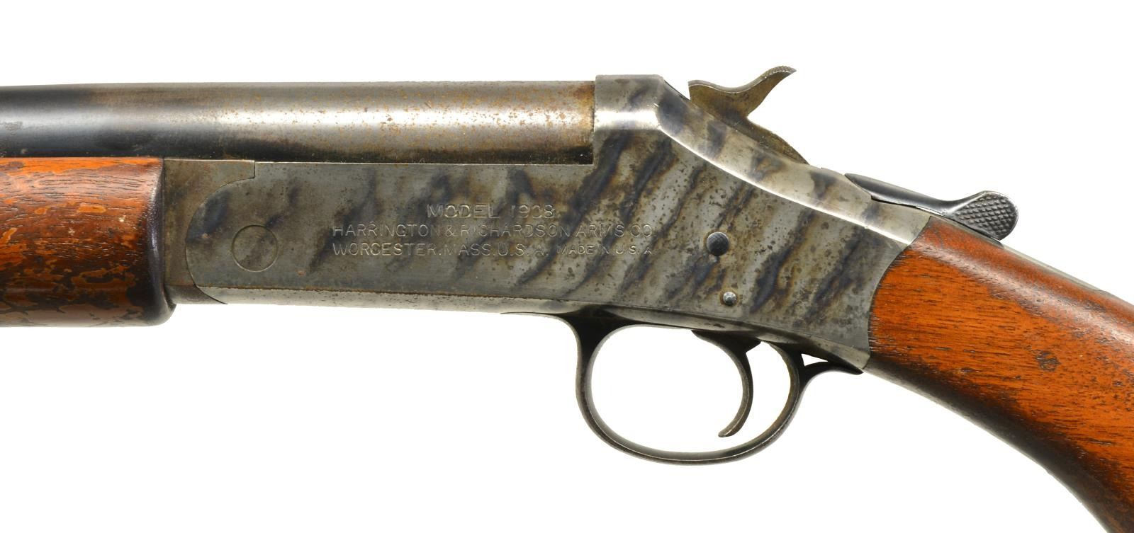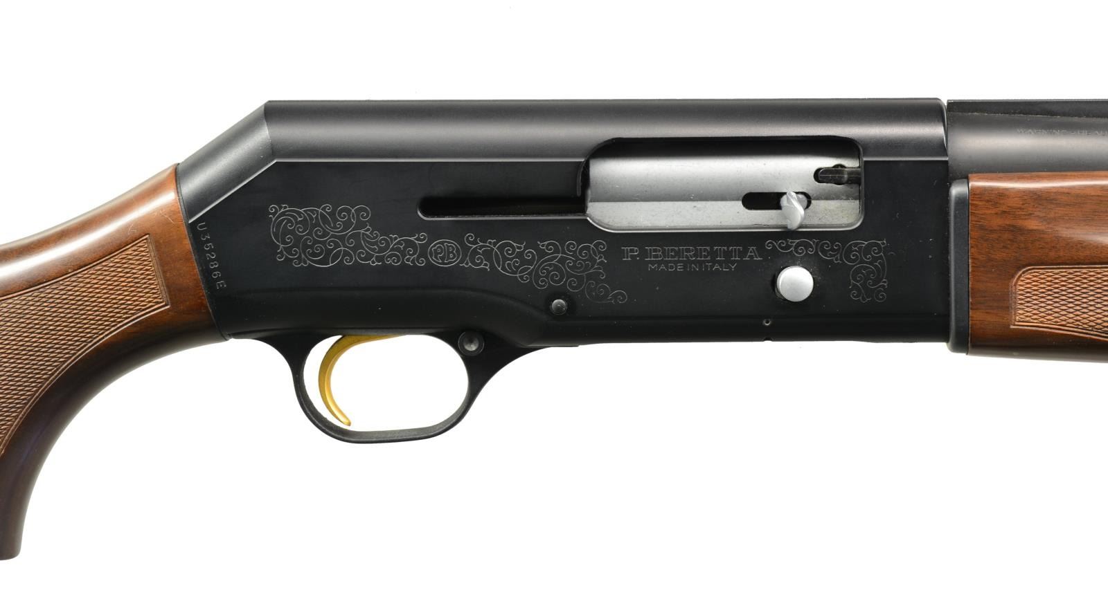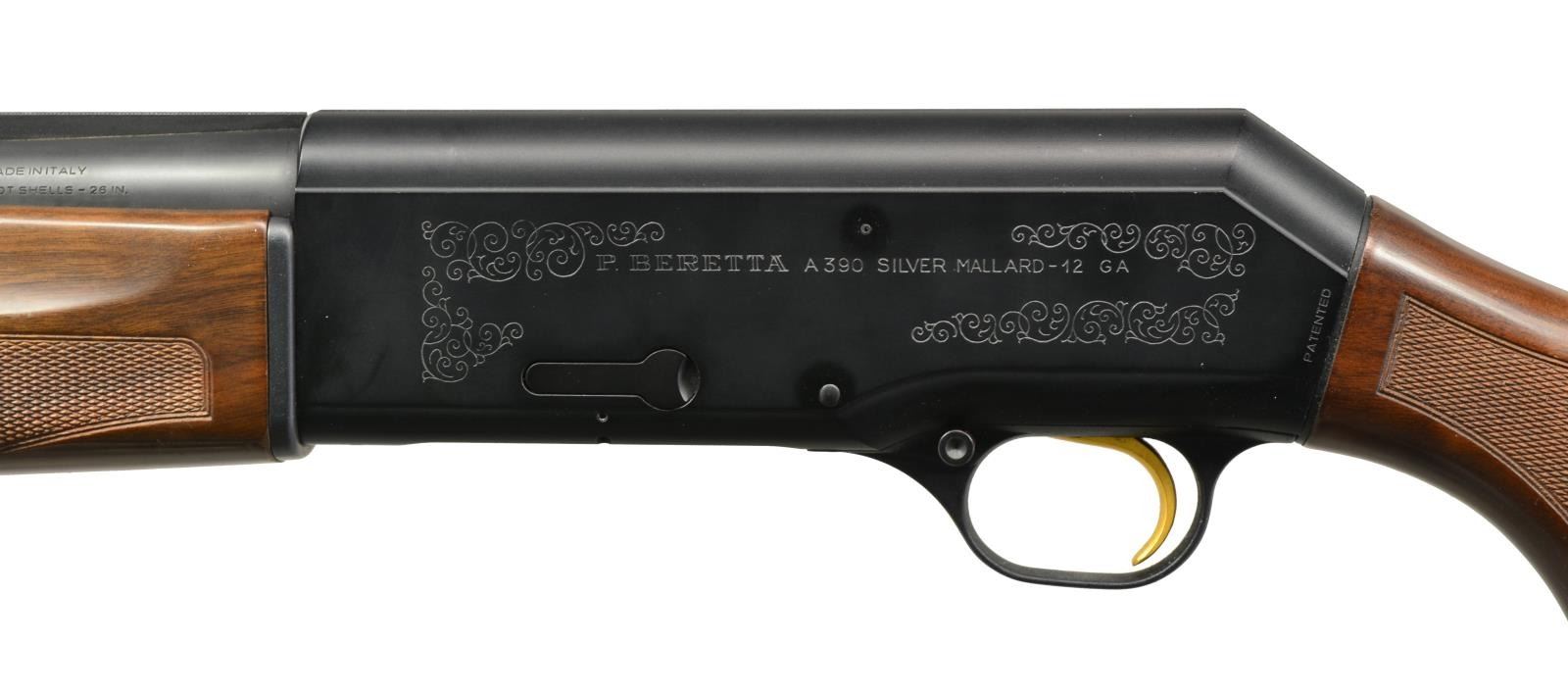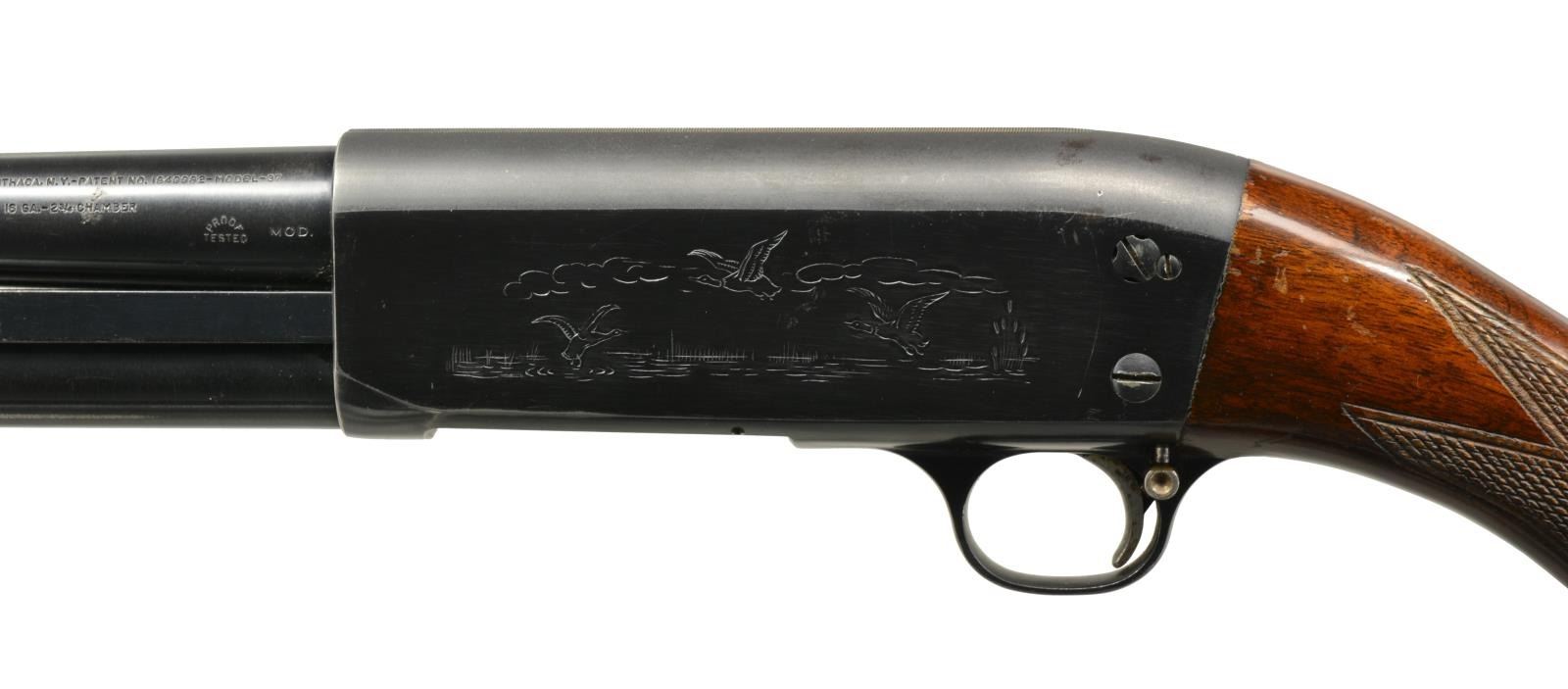 1) HARRINGTON & RICHARDSON 1908 SINGLE SHOT SHOTGUN. Cal. 16 Ga., 2 3/4". S# A457089. Bbl. 28" w/ brass bead & fixed Full choke. Case colored top lever action. Walnut forearm & pistol grip stock w/ original buttplate. CONDITION: bbl. retains 70% dull blued faded to gray in breech area w/ spots of surface corrosion. Action retains 50% faded case colors showing spots of surface corrosion. Wood has worn peeling finish showing dents, scratches & marks. Stock is cracked through wrist area. Good mechanics. Bore is generally bright showing spots of plastic fouling. (20-1865/DS). CURIO. 2) BERETTA A390 SILVER MALLARD AUTOLOADING. Cal. 12 Ga., 2 3/4" & 3". S# U35286E. Bbl. 26" VR w/ Mobile chokes, Mod. tube included. Steel front bead has added pink paint. Alloy receiver w/ gold finished trigger. Forearm & pistol grip walnut stock have cut checkering. LOP: 14 3/8" over solid black aftermarket Decelerator pad. CONDITION: over 98% metal finish. Stock shows sm. scratches & marks w/ open hole in toeline for sling swivel. Very good bright bore. (20-1867/DS). MODERN. 3) ITHACA MODEL 37 PUMP. Cal. 16 Ga., 2 3/4". S# 133094. Bbl. 28" plain over aftermarket Poly-Choke. Brass Bradley style front sight. Original choke marking is "Mod". Blued bottom ejection action w/ roll engraving featuring setter & pheasants on right side w/ flying ducks on right side. Sm. rnd. grooved forearm & hard rubber capped pistol grip stock of nicely grained walnut w/ hand checkering. LOP: 14" over original buttplate. CONDITION: 90% original blue showing edge wear w/ scratches on action. Stock finish shows numerous scratches & handling marks. Good bright bore. (20-1878/DS). CURIO. $600-800.