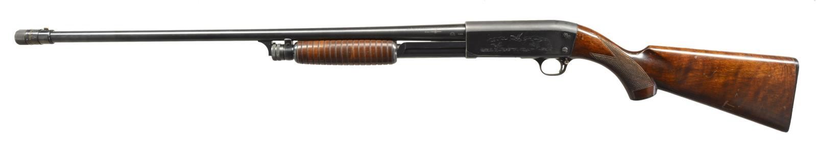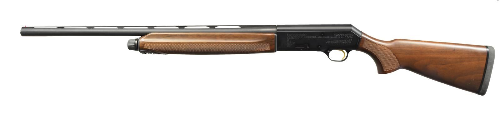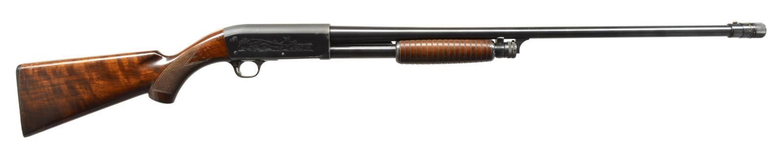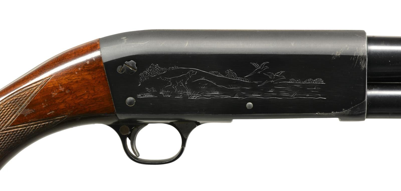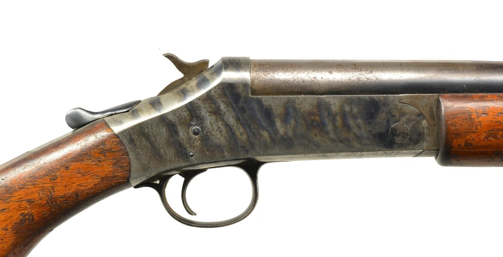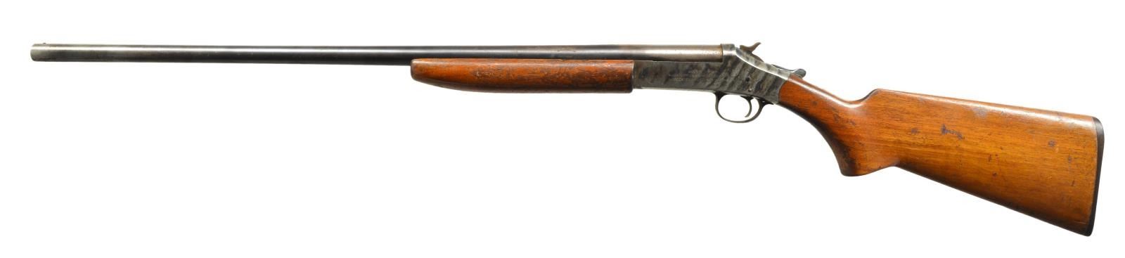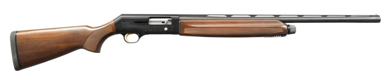 1) HARRINGTON & RICHARDSON 1908 SINGLE SHOT SHOTGUN. Cal. 16 Ga., 2 3/4". S# A457089. Bbl. 28" w/ brass bead & fixed Full choke. Case colored top lever action. Walnut forearm & pistol grip stock w/ original buttplate. CONDITION: bbl. retains 70% dull blued faded to gray in breech area w/ spots of surface corrosion. Action retains 50% faded case colors showing spots of surface corrosion. Wood has worn peeling finish showing dents, scratches & marks. Stock is cracked through wrist area. Good mechanics. Bore is generally bright showing spots of plastic fouling. (20-1865/DS). CURIO. 2) BERETTA A390 SILVER MALLARD AUTOLOADING. Cal. 12 Ga., 2 3/4" & 3". S# U35286E. Bbl. 26" VR w/ Mobile chokes, Mod. tube included. Steel front bead has added pink paint. Alloy receiver w/ gold finished trigger. Forearm & pistol grip walnut stock have cut checkering. LOP: 14 3/8" over solid black aftermarket Decelerator pad. CONDITION: over 98% metal finish. Stock shows sm. scratches & marks w/ open hole in toeline for sling swivel. Very good bright bore. (20-1867/DS). MODERN. 3) ITHACA MODEL 37 PUMP. Cal. 16 Ga., 2 3/4". S# 133094. Bbl. 28" plain over aftermarket Poly-Choke. Brass Bradley style front sight. Original choke marking is "Mod". Blued bottom ejection action w/ roll engraving featuring setter & pheasants on right side w/ flying ducks on right side. Sm. rnd. grooved forearm & hard rubber capped pistol grip stock of nicely grained walnut w/ hand checkering. LOP: 14" over original buttplate. CONDITION: 90% original blue showing edge wear w/ scratches on action. Stock finish shows numerous scratches & handling marks. Good bright bore. (20-1878/DS). CURIO. $600-800.