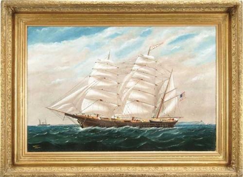 H. R. BUTMAN (19th/20th Century) SHIP PORTRAIT OF THE GERTRUDE A. SPENCER. Large oil on canvas marine scene shows a large three-mast clipper ship sailing right to left with a steam sail ship off bow. A large woman figurehead is seen at bow, four men on board. Full sail with American flag on stern. The ships name is on the bow and flies the ship pennant at middle mast. A point of land is seen off stern with two lighthouses and other boats. Signed lower left “H R Butman 1902”. Housed in a fine gesso decorated deep antique frame. SIZE: 24” x 36”. CONDITION: Minor inpainting, very good. 9-26545