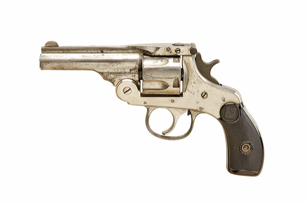 Condition: Some finish loDouble action top break 5 shot revolver for black powder shells. Nickel finish, black checkered grips, 3 1/4" barrel with fixed sights, dirty barrel but should clean to good, nice working action.Condition: Some finish loss and a small amount of surface rust but gun is a solid.