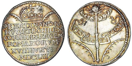 Obv: Crown with two wreaths / FERDINAND: IV. / HVNG:ET BOHREX / CORON:IN.REGEM / ROMANORVM. / XVIII.IVNY / MDCLIII