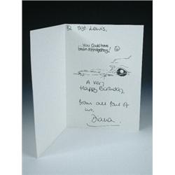 H.R.H. The Princess of Wales. Birthday card, with picture of a dancing hedgehog, printed caption "Is your birthday a Prickly Subject..." [and inside] picture of a car crushing a hedgehog and printed caption "You could have been a Hedgehog", inscribed by Diana "To Sgt. Lewis, a very Happy Birthday, from all four of us, Diana", with a smiley face £80-120