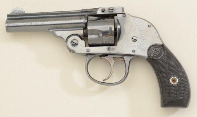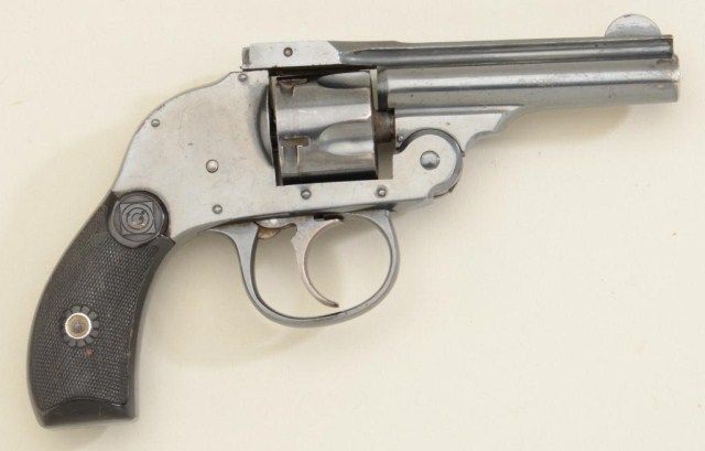 H&R Hammerless DA revolver, .32 cal., blue finish, checkered hard rubber grips, missing barrel latch and some internal parts, otherwise very good condition; good project piece. Est.: $40-$80.
