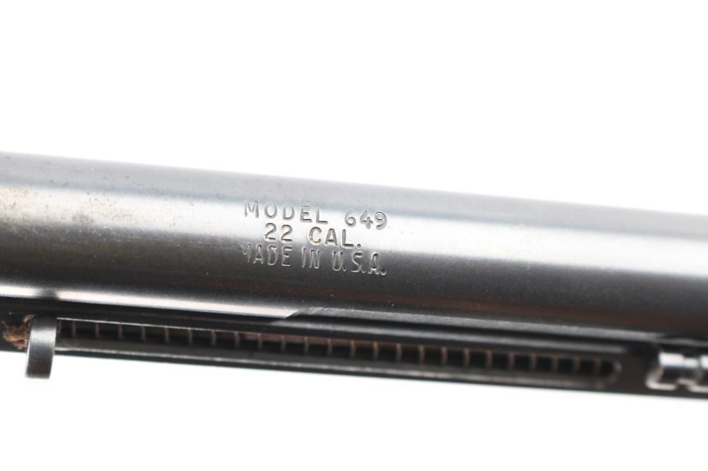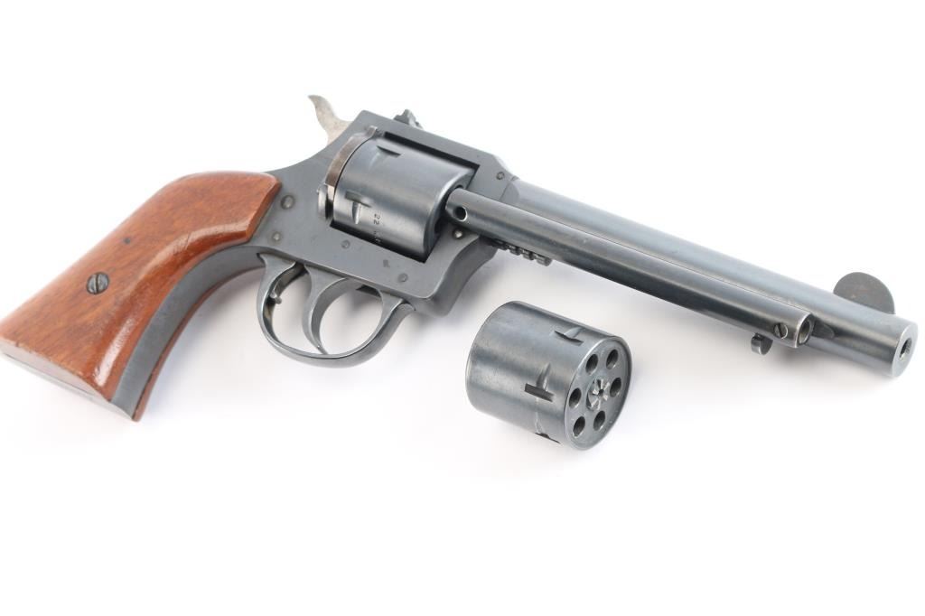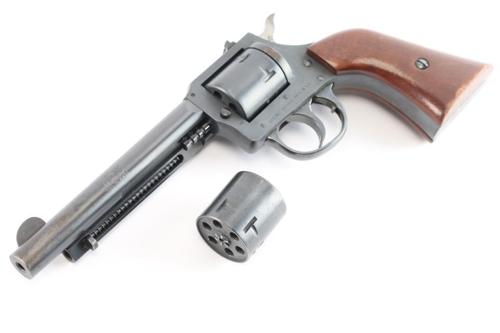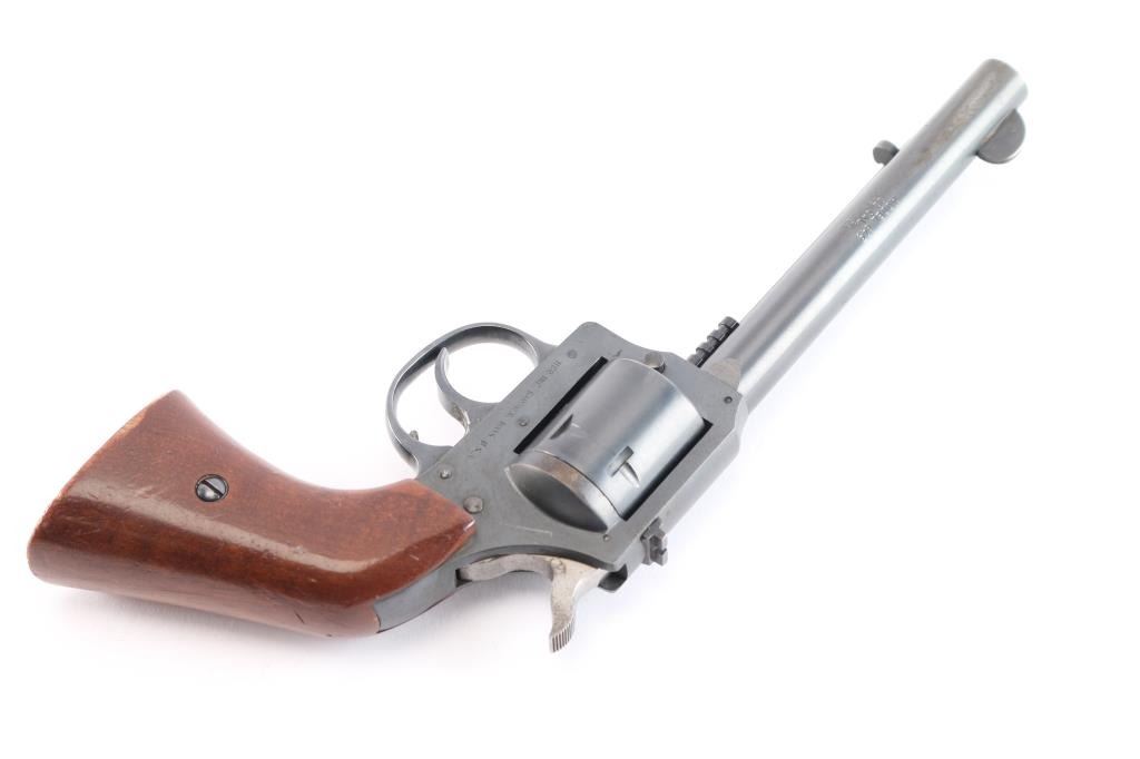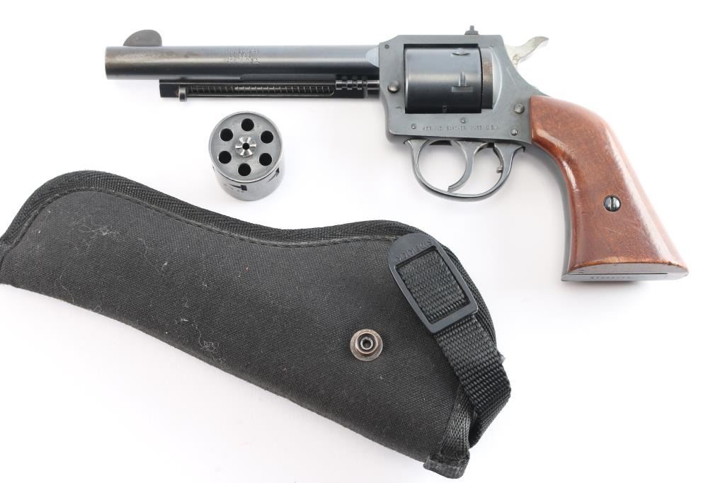 Produced 1976. Six-shot double action revolver chambered for .22 W.M.R.F, with extra cylinder in .22 LR, manufactured in Gardner, MA. Features a blued finish, 5.5" round barrel, ejector rod, blade front sight, dovetailed rear sight with square notch, non- fluted cylinder, smooth trigger with beveled edges, serrated hammer spur, and smooth walnut grips with wear on the edges. Revolver exhibits approximately 98% of its original finish with faint tracking. There is some light pitting on the barrel and front blade sight. Action is smooth with good lock-up, the bore is excellent and wood grips are excellent. Comes with canvas holster.