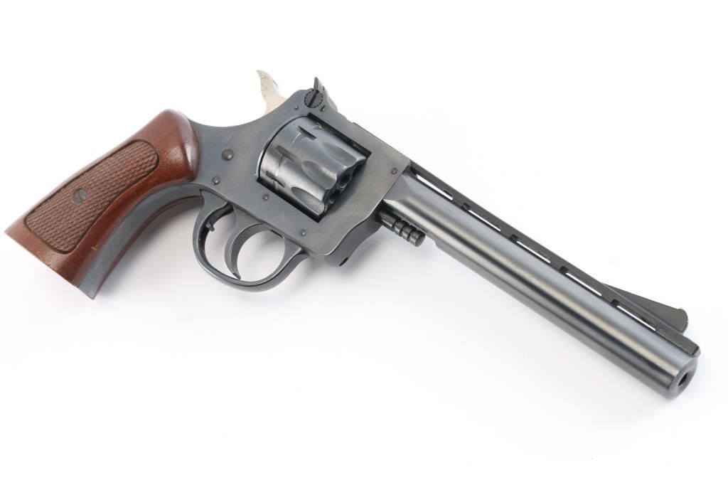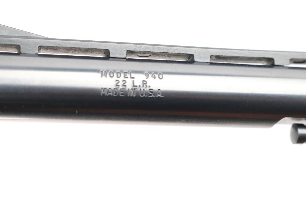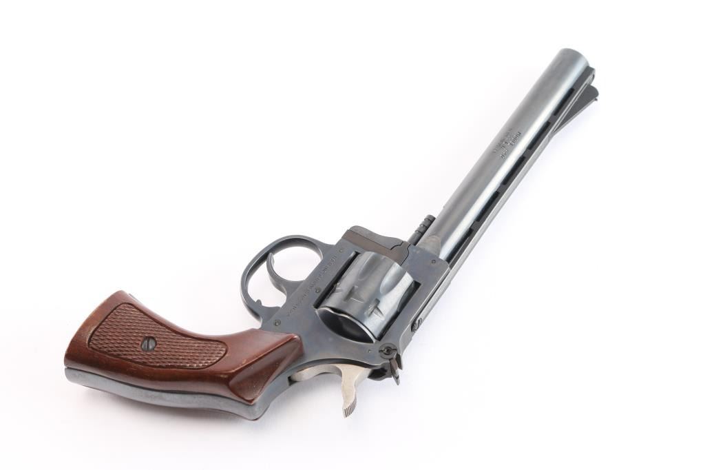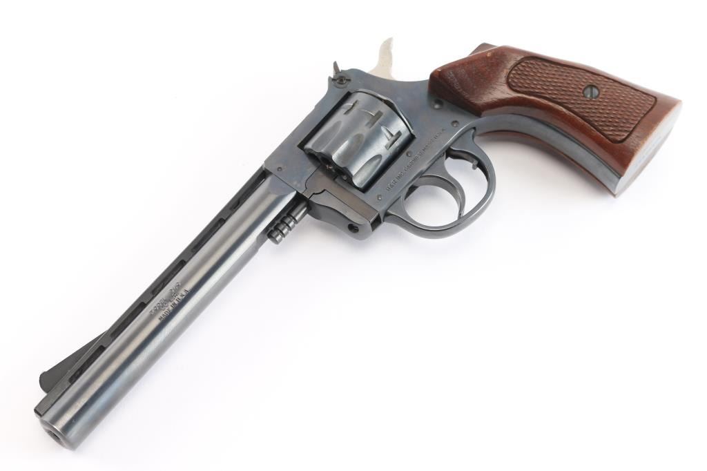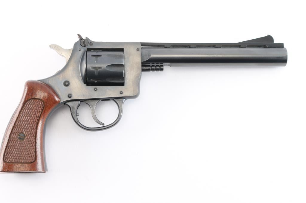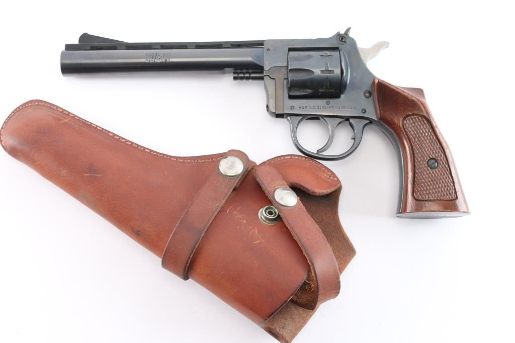Harrington & Richardson (H&R) Model: 940, 6" barrel The left side of the barrel is marked “MODEL 940. .22 L.R. MADE IN U.S.A. The left frame is marked H&R INC. / GARDNER, MASS. U.S.A.”. The underside of the grip strap is marked with the serial number. Blue finish, 9-shot swing out cylinder. The front sight is a ramped blade integral to the vent rib above the muzzle. The rear sight is a square-notch installed to the rear of the top strap and is adjustable for windage. The grips are two-piece checkered walnut panels. The left panel has a semi-thumb rest. There are a couple of light scratches and nicks on the grips. The checkering remains sharp and there are no chips or cracks. The grips are in Excellent overall condition. Bore is excellent,action is smooth with tight lock-up. Finish is about 95% with edge wear, some chips on the vent rib. Manufactured 1977. Comes with a Hunter brown leather snap holster.