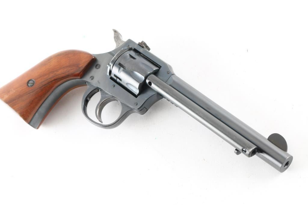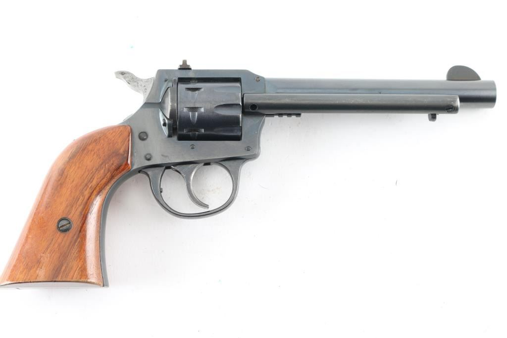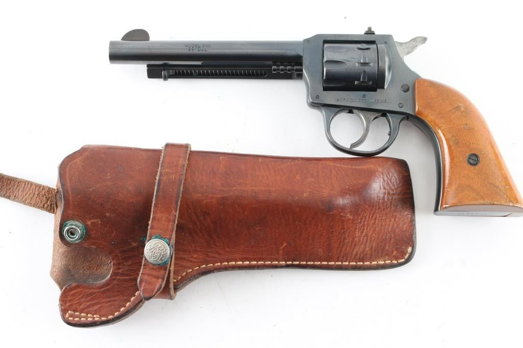 American made double action 9 shot revolver chambered in .22 caliber. It has a flat blue finish, smooth wood grips, 5 1/2" barrel, fixed blade front sight, dovetailed rear notch sight, Smooth trigger and hammer with serrated hammer spur. Left side of barrel marked Model 949 22 CAL. Metal finish looks very good with little sign of use or handling. Wood grips are good with one very small nick on the back. Bore looks great, bright. Comes with a brown leather holster. Condition is NRA Excellent. **Modern Firearm**
