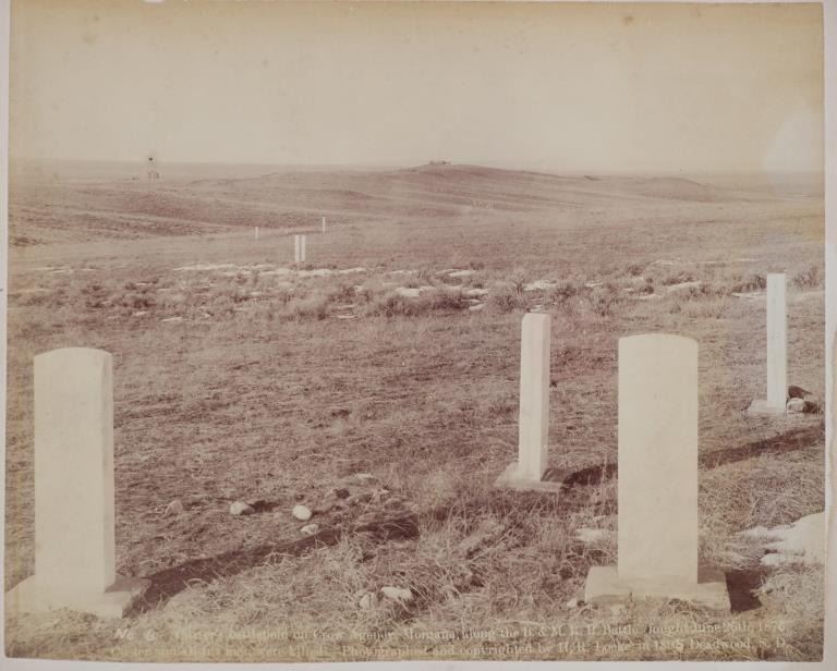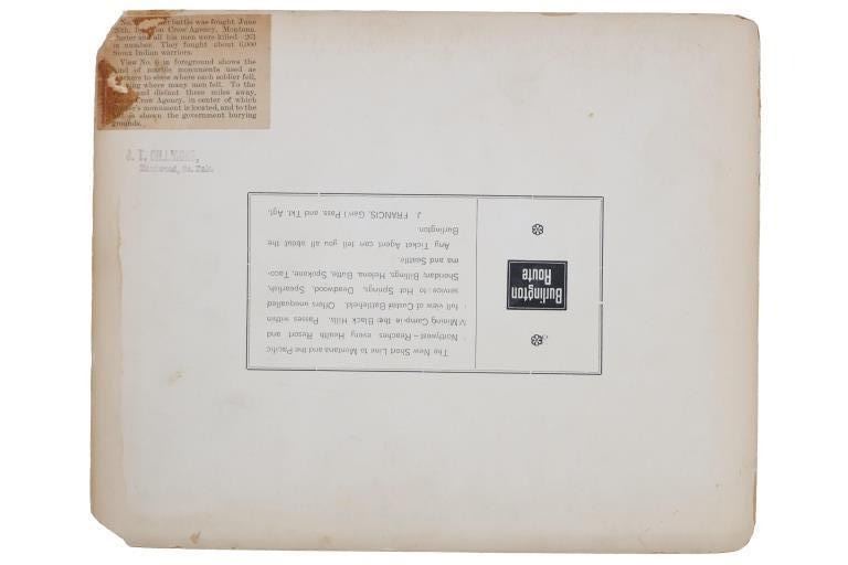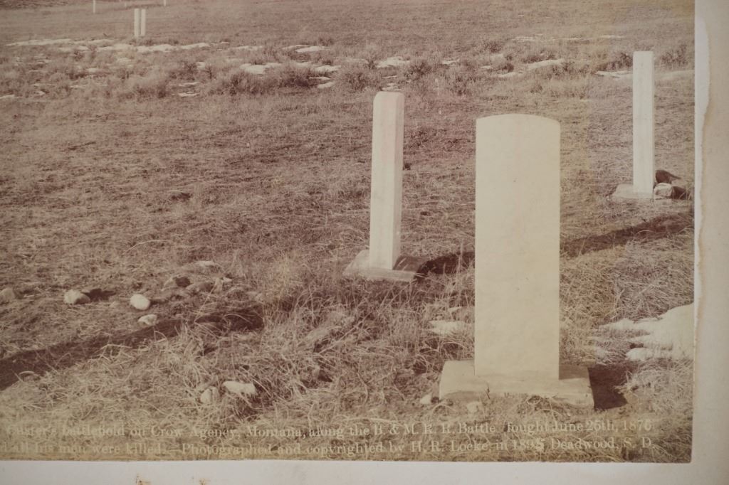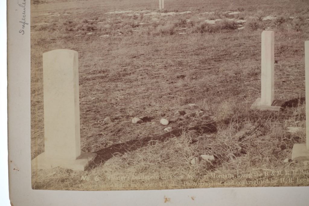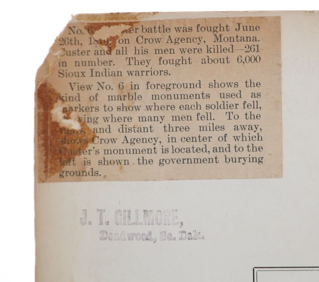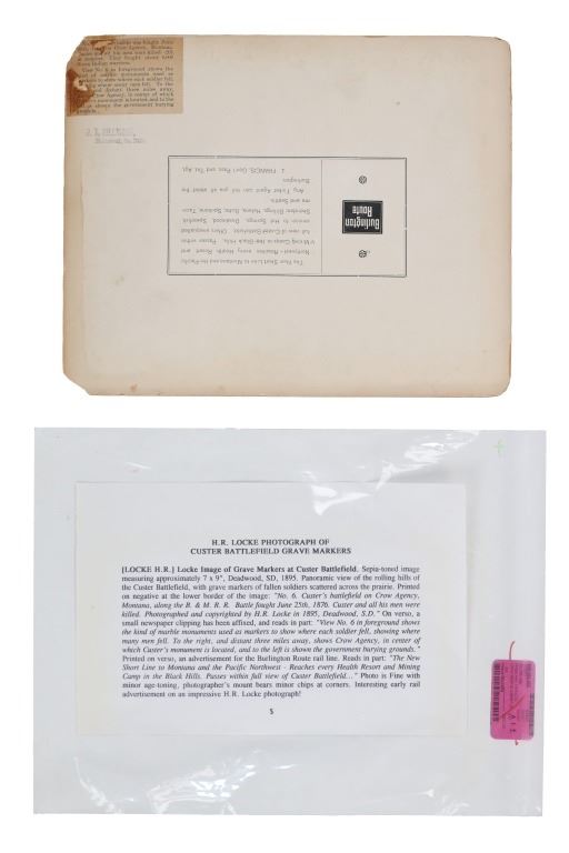 Featured in this lot is this mammoth boudoir card titled: No.6 Custer Battlefield on Crow Agency, Montana, along the B. & M. R. R. Battle, fought June 26th, 1876. Custer and all his men were killed. Photographed and copyrighted by H.R. Locke, in 1895, Deadwood, S.D.; by circa 1895 by H.R. Locke born in 1867 and died in 1927. Provenance: From an Ex-Museum collection out of Eastern Montana; Ex-Heritage Auction; and ex-J.T. Gillmore Deadwood, South Dakota collection. The boudoir card features a wonderfully and professionally crafted construction that shows the Custer Battlefield with grave markers up close ans howing a panoramix view of the rolling hills of the Custer Battlefield, with grave markers of fallen soldiers scattered across the prairie. On Verso, a small newspaper clipping has been affixed, and reads in part: "View No.6 in foreground shows the kind of marble monuments used as markers to show where each soldier fell, showing where many men fell. To the right, and distant three miles away, shows Crow Agency, in center of which Custer's monument is located, and to the left is shown Crow Agency, in the center of which Custer's monument is located, and to the left is shown the government burying grounds." Fort Custer was built near the Agency the same year. The Plains line of the B & M Railroad was built west along the Platte River from Kearney, Nebraska, during the 1880s. A northern spur route reached Sheridan, Wyoming, in 1893. During 1894-95 it was extended past Crow Agency to Billings, Montana, in the Yellowstone River valley. H. R. Locke was hired to make promotional photographs along the route. The back bears the “J.T. GILLMORE Deadwood, Sa. Dak.” stamp, which has been documented on several H.R. Locke images, including the images in this auction as well as images in the Yale University Library collection. This is believed to be James T. Gillmore (born August 4, 1841) who was the owner and manager of the Gillmore Hotel at Deadwood, South Dakota Territory as well as having holdings in the Montezuma and the Whizzer mines. The condition of this mammoth boudoir card is well preserved with the top and bottom right corners showing breaks in the cardstock with browning to the card consistent with age but otherwise shows a well preserved condition. The measurements of this boudoir card is 7 7/8" x 9 3/4". The collective weight of this boudoir card is U4oz.
