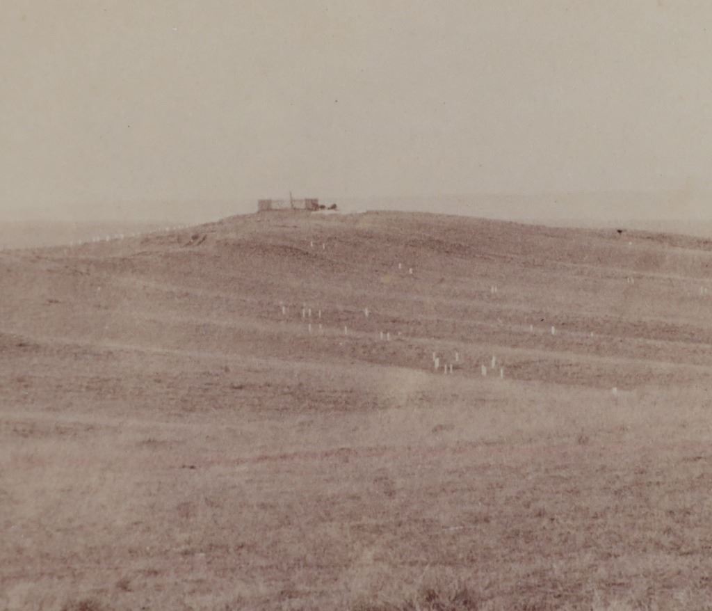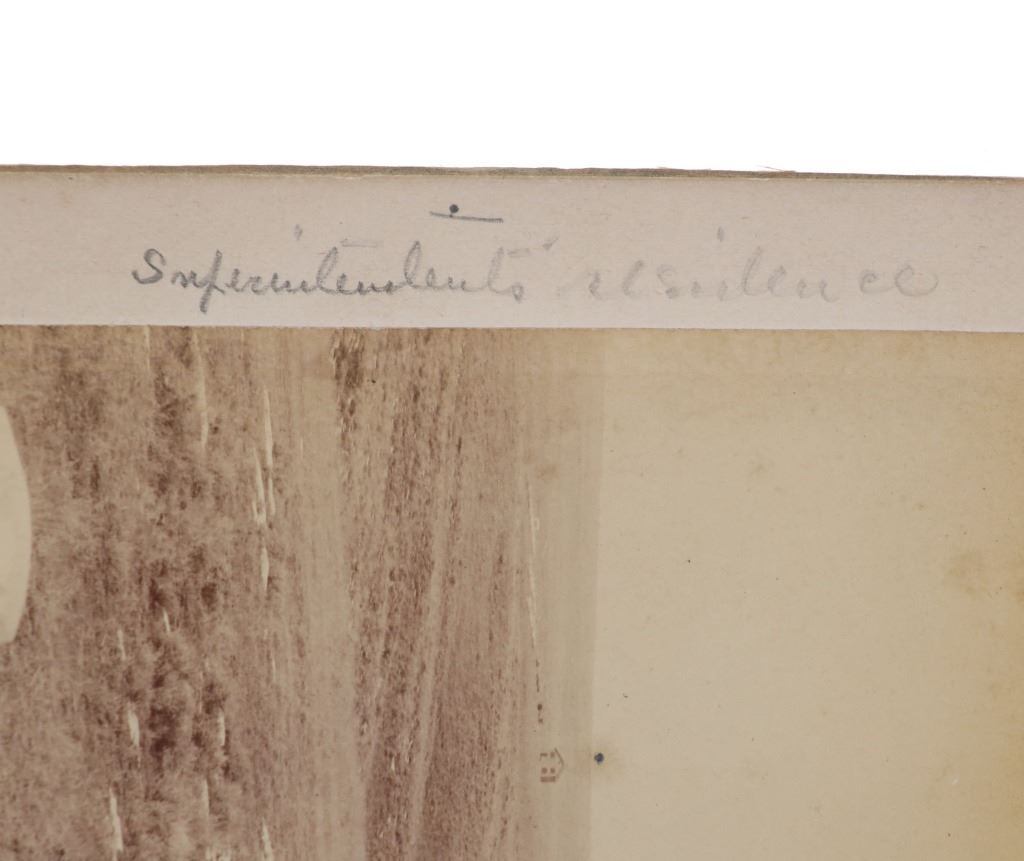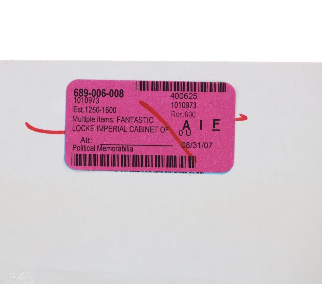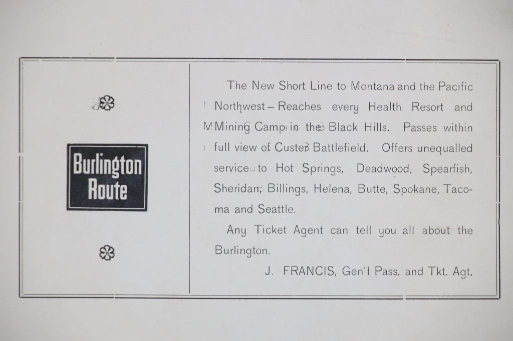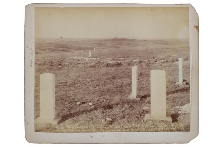 Featured in this lot is this mammoth boudoir card titled: No.6 Custer Battlefield on Crow Agency, Montana, along the B. & M. R. R. Battle, fought June 26th, 1876. Custer and all his men were killed. Photographed and copyrighted by H.R. Locke, in 1895, Deadwood, S.D.; by circa 1895 by H.R. Locke born in 1867 and died in 1927. Provenance: From an Ex-Museum collection out of Eastern Montana; Ex-Heritage Auction; and ex-J.T. Gillmore Deadwood, South Dakota collection. The boudoir card features a wonderfully and professionally crafted construction that shows the Custer Battlefield with grave markers up close ans howing a panoramix view of the rolling hills of the Custer Battlefield, with grave markers of fallen soldiers scattered across the prairie. On Verso, a small newspaper clipping has been affixed, and reads in part: "View No.6 in foreground shows the kind of marble monuments used as markers to show where each soldier fell, showing where many men fell. To the right, and distant three miles away, shows Crow Agency, in center of which Custer's monument is located, and to the left is shown Crow Agency, in the center of which Custer's monument is located, and to the left is shown the government burying grounds." Fort Custer was built near the Agency the same year. The Plains line of the B & M Railroad was built west along the Platte River from Kearney, Nebraska, during the 1880s. A northern spur route reached Sheridan, Wyoming, in 1893. During 1894-95 it was extended past Crow Agency to Billings, Montana, in the Yellowstone River valley. H. R. Locke was hired to make promotional photographs along the route. The back bears the “J.T. GILLMORE Deadwood, Sa. Dak.” stamp, which has been documented on several H.R. Locke images, including the images in this auction as well as images in the Yale University Library collection. This is believed to be James T. Gillmore (born August 4, 1841) who was the owner and manager of the Gillmore Hotel at Deadwood, South Dakota Territory as well as having holdings in the Montezuma and the Whizzer mines. The condition of this mammoth boudoir card is well preserved with the top and bottom right corners showing breaks in the cardstock with browning to the card consistent with age but otherwise shows a well preserved condition. The measurements of this boudoir card is 7 7/8" x 9 3/4". The collective weight of this boudoir card is U4oz.