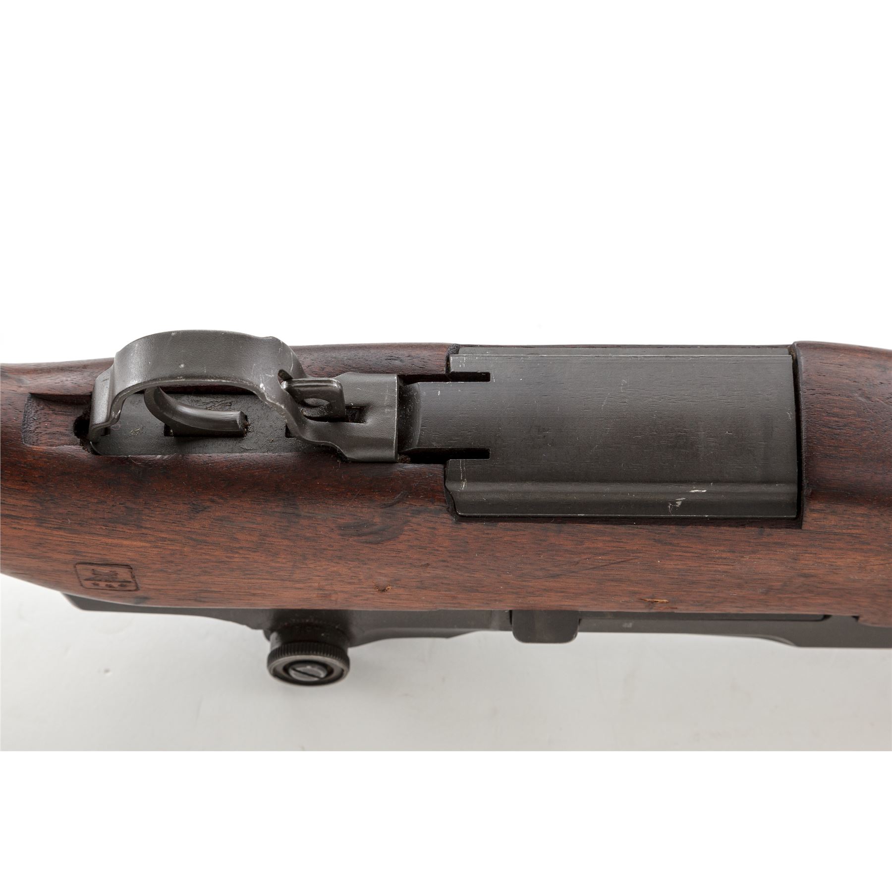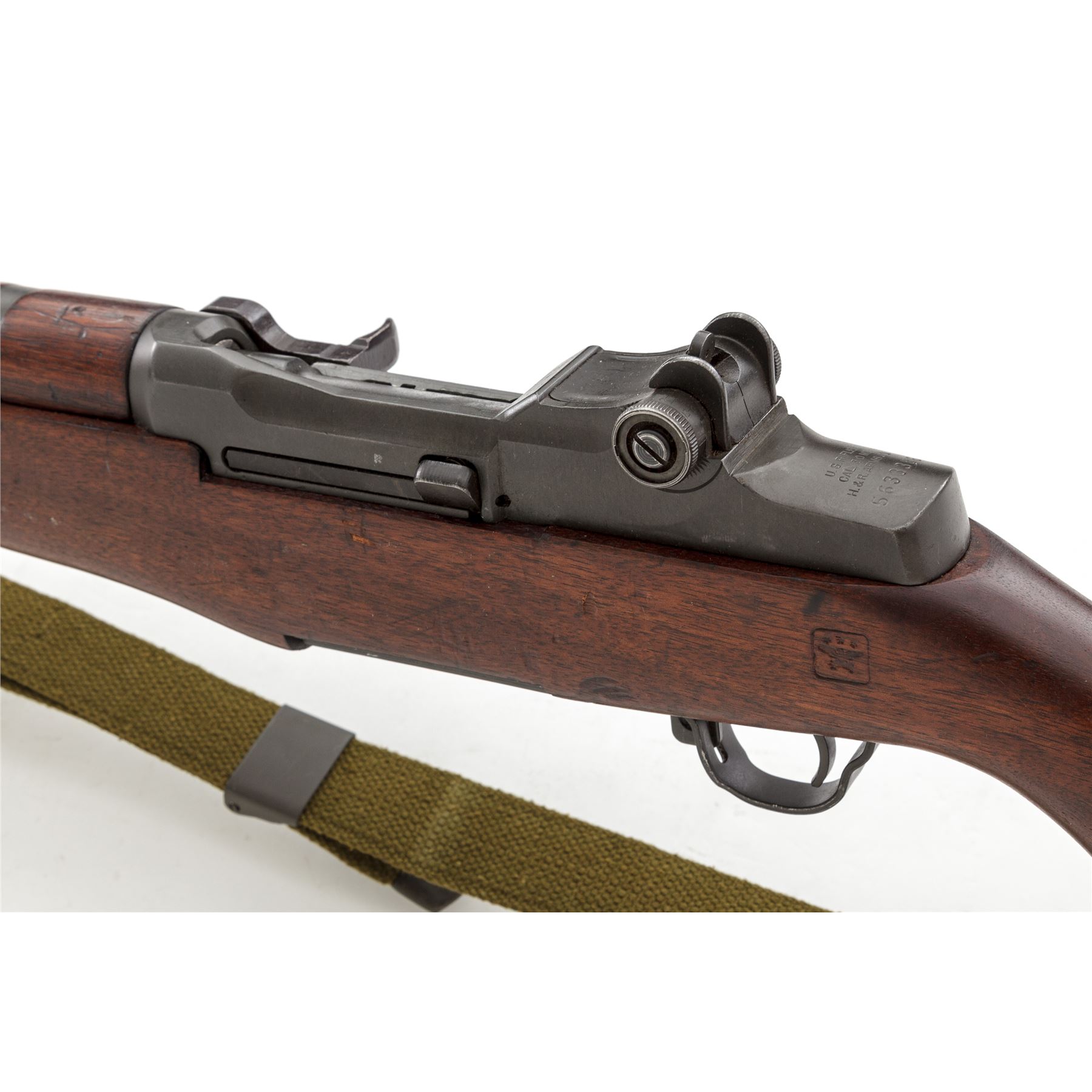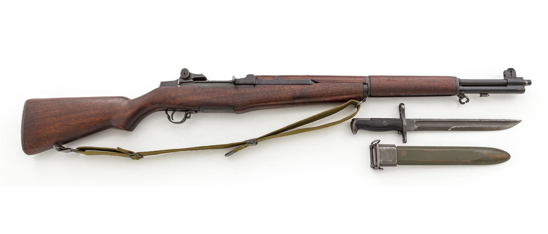 U.S. M1 Garand Semi-Automatic Rifle, with Bayonet and Scabbard, by H&R Arms,  #5633386, .30-06 cal., 24'' barrel, parkerized finish, walnut stock, blade front sight with protecting ears and adjustable aperture rear sight. Marked on receiver tang ''U.S.RIFLE CAL..30 M1 H&R ARMS CO.''. Marked on barrel ''HRA 5 55''. Bolt, trigger housing, and operating rod marked ''SA''. Stock is marked on left side with Defense Dept cartouche and a circle ''P'' firing proof on underside of wrist. Condition overall is very good+, with approx. 95% finish remaining on the metal showing thinning to the buttplate. Rear handguard is good with marring. Front handguard and stock are very good with scattered marring and lighter handling marks. Action is smooth, bright bore is excellent with excellent rifling. No visible import stamps. Includes a green Danish Army sling in excellent condition. A Civilian Marksmanship Program Certificate of Authenticity and a CMP shipping box are included. The arsenal shortened M1 bayonet has a 10'' parkerized blade; ricasso is marked  ''U.S'' and ''R.I.A. 1906''. Latch functions smoothly. Condition overall is very good with sharpening to the blade and a nick to the point. Scabbard is good with wear and scratches to the surface.  Est.:  $1,000-$1,500. (C&R)