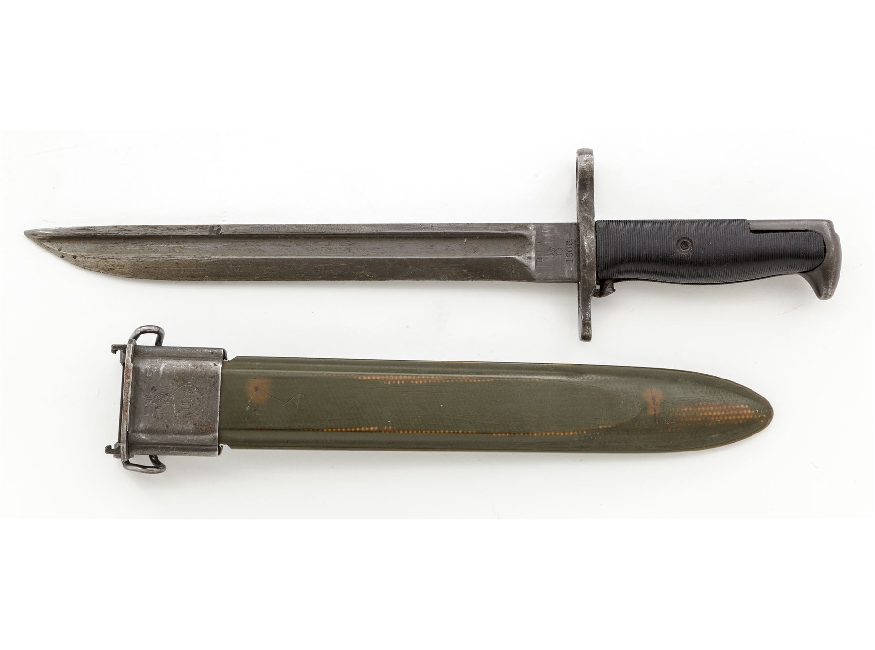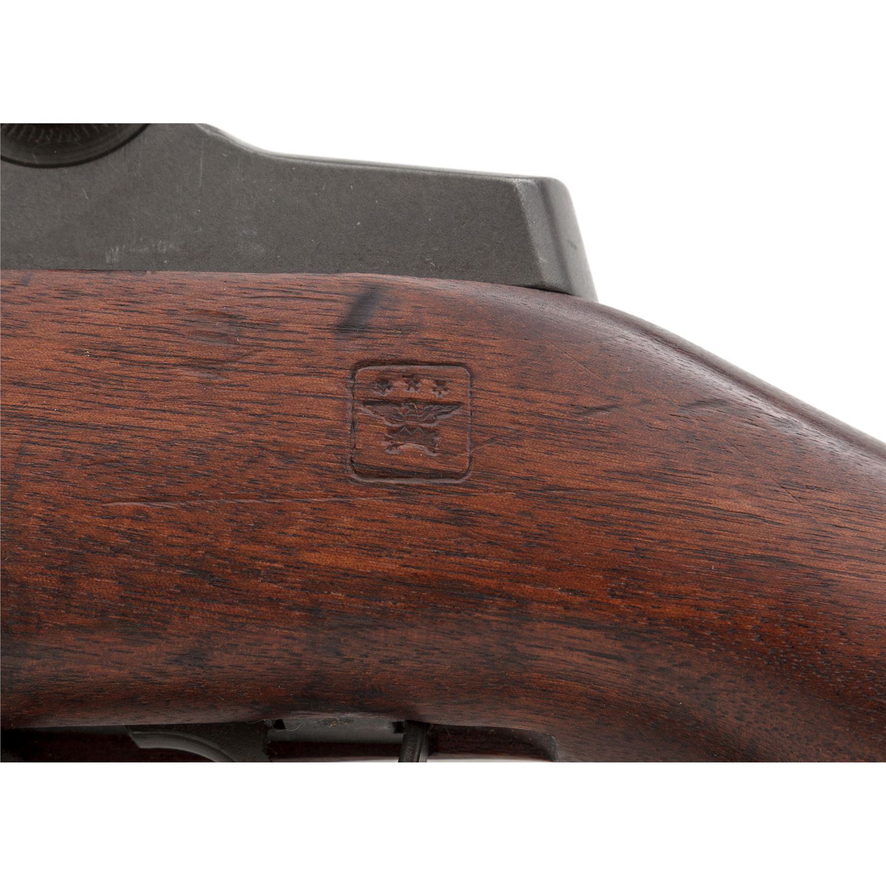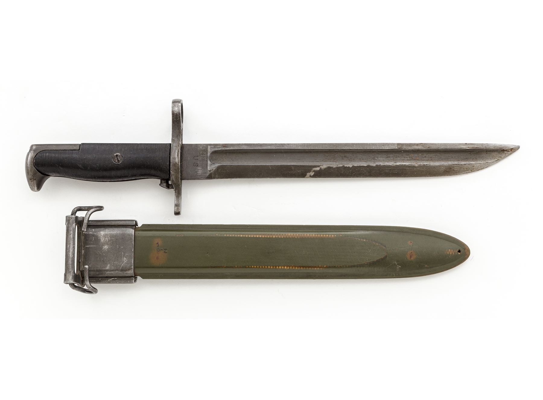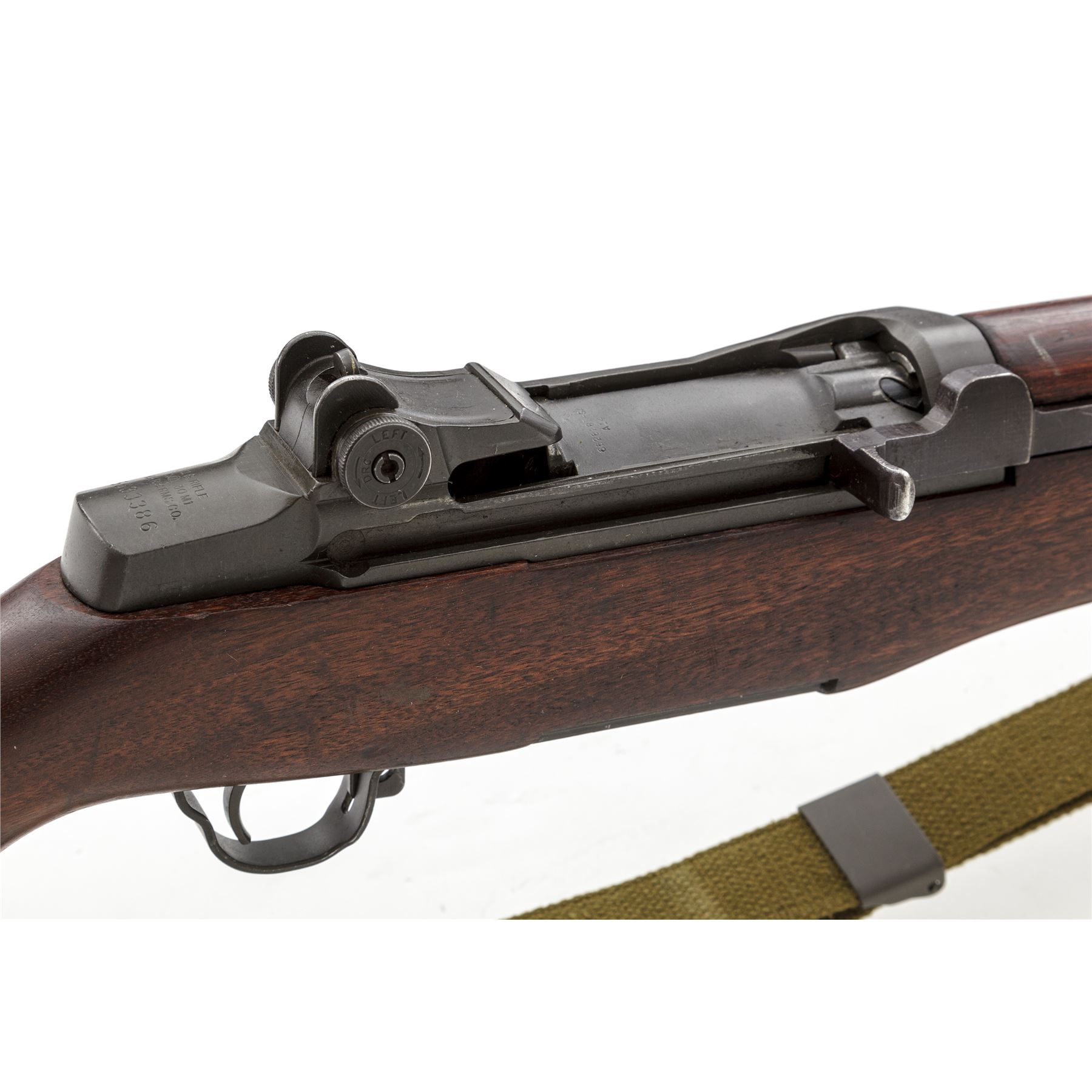 U.S. M1 Garand Semi-Automatic Rifle, with Bayonet and Scabbard, by H&R Arms,  #5633386, .30-06 cal., 24'' barrel, parkerized finish, walnut stock, blade front sight with protecting ears and adjustable aperture rear sight. Marked on receiver tang ''U.S.RIFLE CAL..30 M1 H&R ARMS CO.''. Marked on barrel ''HRA 5 55''. Bolt, trigger housing, and operating rod marked ''SA''. Stock is marked on left side with Defense Dept cartouche and a circle ''P'' firing proof on underside of wrist. Condition overall is very good+, with approx. 95% finish remaining on the metal showing thinning to the buttplate. Rear handguard is good with marring. Front handguard and stock are very good with scattered marring and lighter handling marks. Action is smooth, bright bore is excellent with excellent rifling. No visible import stamps. Includes a green Danish Army sling in excellent condition. A Civilian Marksmanship Program Certificate of Authenticity and a CMP shipping box are included. The arsenal shortened M1 bayonet has a 10'' parkerized blade; ricasso is marked  ''U.S'' and ''R.I.A. 1906''. Latch functions smoothly. Condition overall is very good with sharpening to the blade and a nick to the point. Scabbard is good with wear and scratches to the surface.  Est.:  $1,000-$1,500. (C&R)