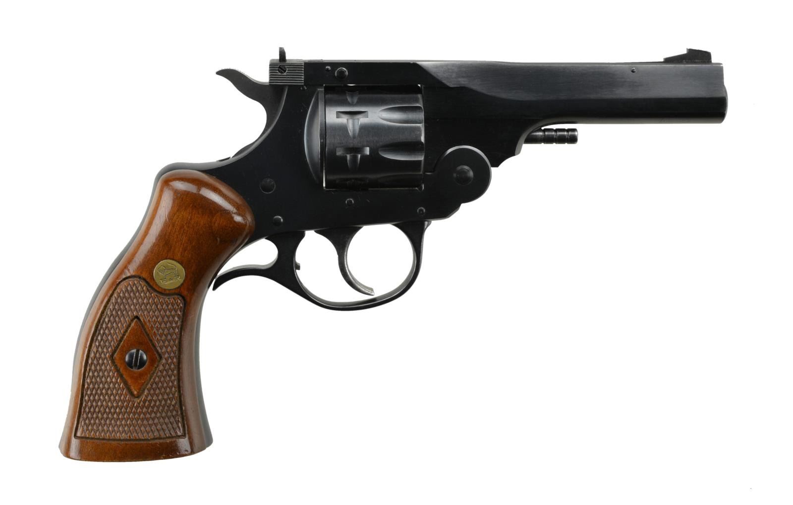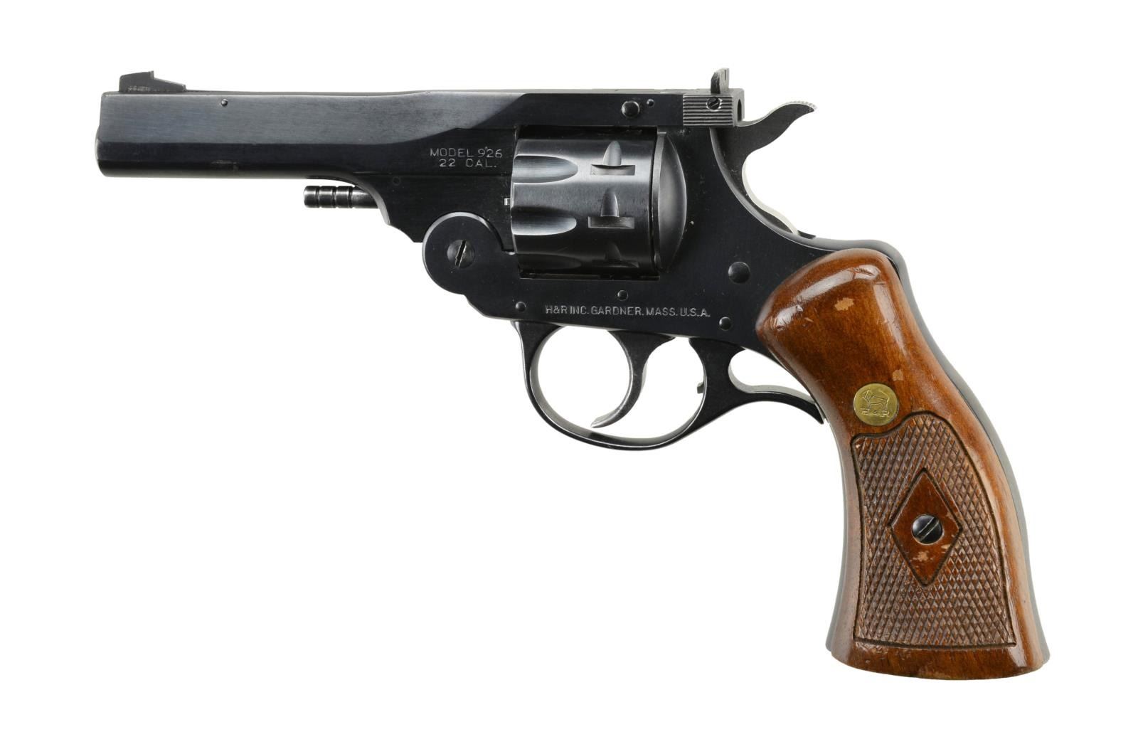 Cal. 22LR S# AM34453 Bbl.4" w/ patridge front and adjustable rear sights. Blued finish. Top break action, double action revolver. Fluted 9-shot cylinder w/ manual ejector. Checkered walnut grips w/ gold H&R medallions. CONDITION: Bluing retains full coverage w/ gentle thinning on high spots & one small area on barrel in front of ejector. Not even a thin drag line on cylinder. Grips demonstrate some flaking & small impressions. Bright bore w/ visible rifling. (22-2432/JZ). MODERN. $100-200