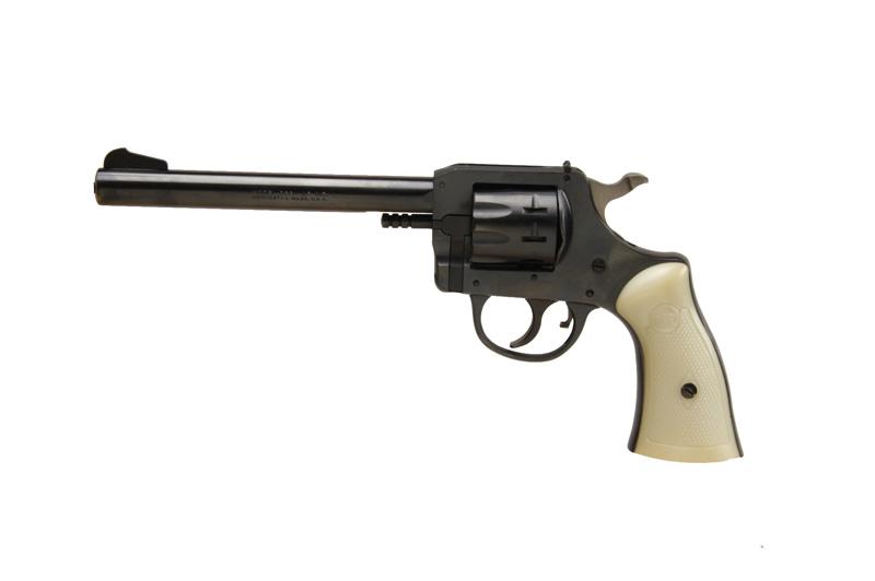 Condition: Excellent and hardly used with tiny bit of thinning aNice double action, swing out cylinder 9 shot .22 caliber revolver. Blued finish, ivory colored plastic grips, 6" barrel, good bore and action. Condition: Excellent and hardly used with tiny bit of thinning at the muzzle.