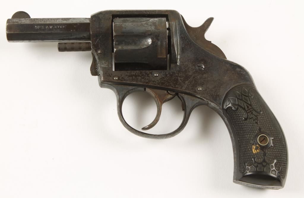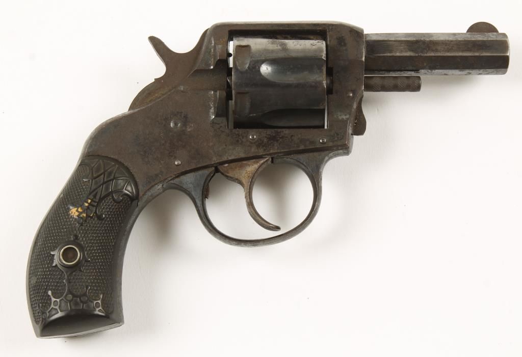Early double action six shot revolver. With 2-1/2" octagon barrel, blued finish, checkered plastic grips, and fixed sights. Good bore and action. Condition: Fair to good showing 80% original finish with light pitting throughout and wear on top strap. *Curio & Relic Firearm*