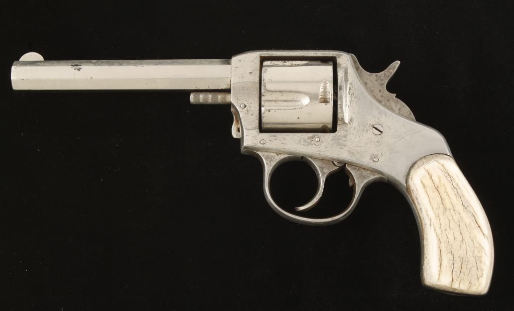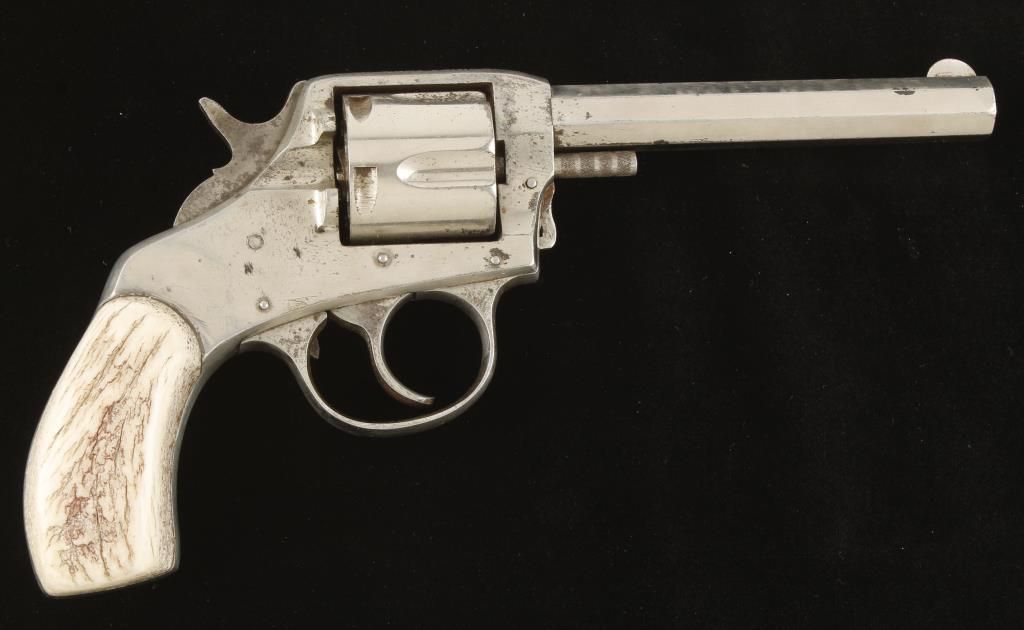 Double action solid frame 5 shot revolver with 4-1/2" octagon barrel. Nickel finish, stag grips and fixed sights. Stag grips have been glued on and cannot be removed. Bore is dark and action in good working order. Condition: Fair showing light pitting throughout, frame has been cleaned and grips are good. *Curio & Relic Firearm*