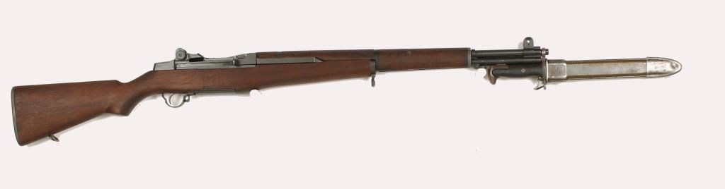 Harrington & Richardson made. With bayonet marked "AFH US1943". Both bayonet and scabbard have the flaming bomb ordnance mark. The stock has a Circle P cartouche just behind the trigger guard and a Department of Defense acceptance mark on the left side. The stock has very few dings and the front and rear hand guards have only a few each. The condition of the metal is very good with only a slight greenish tinge on the rear of the receiver. Barrel is bright with good rifling. Condition is very good.
