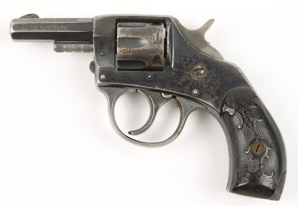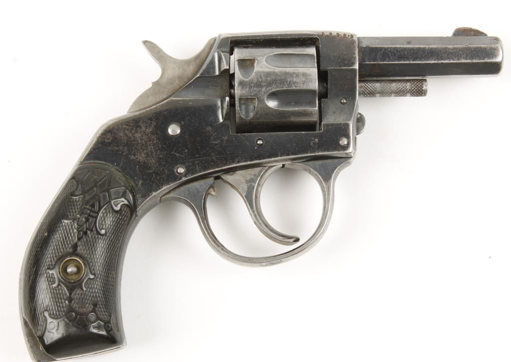Small frame double action 7 shot revolver with 2" octagon barrel. Blued finish, checkered black plastic grips and fixed sights. Fair bore and hammer does not cock back, works as a double action. Condition: Fair showing light scratching, thinning bluing and both grip panels have large chip.