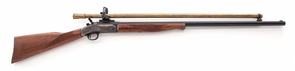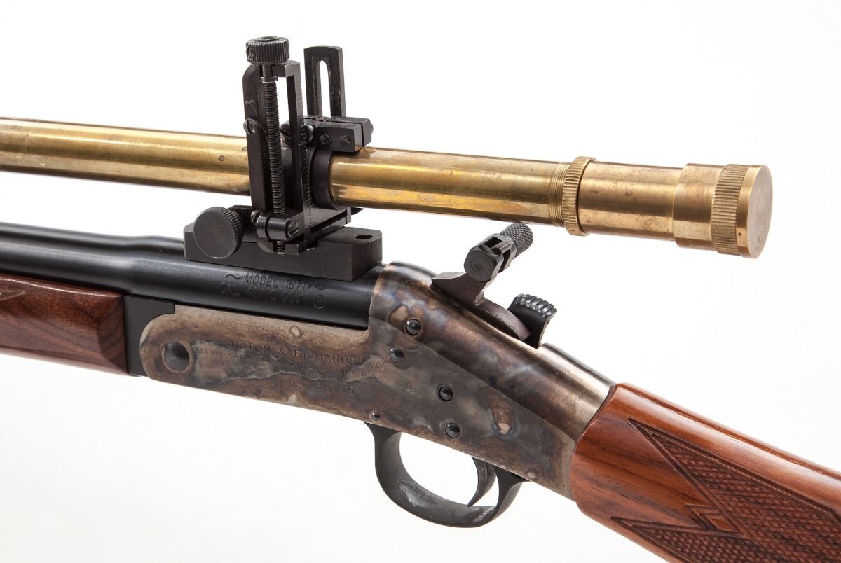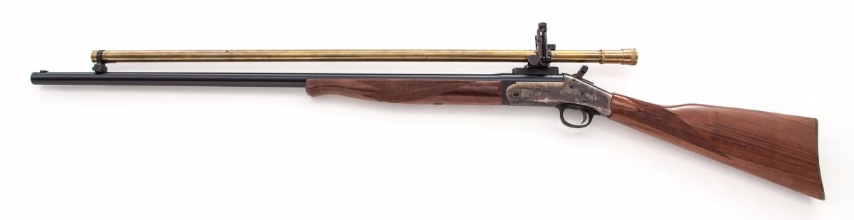 Harrington & Richardson Model 1871 Single Shot ''The Buffalo'' Rifle, #HT389445, .45-70 cal., 32'' blue barrel, case hardened frame and buttplate, checkered walnut stock and forend. Topped with a Hakko 6x15 brass scope with covers. Condition is excellent showing little use. Scope shows micro-scratching and some discoloration. Action is tight, bore is bright, scope optics are clear. Est.: $600-$800. (Modern)