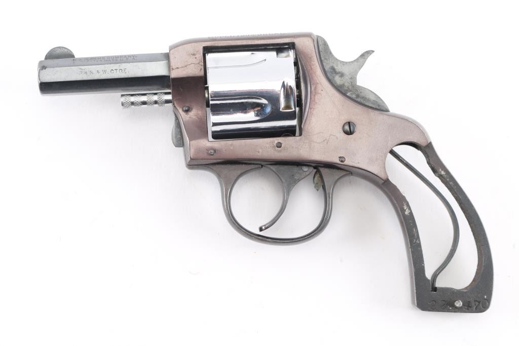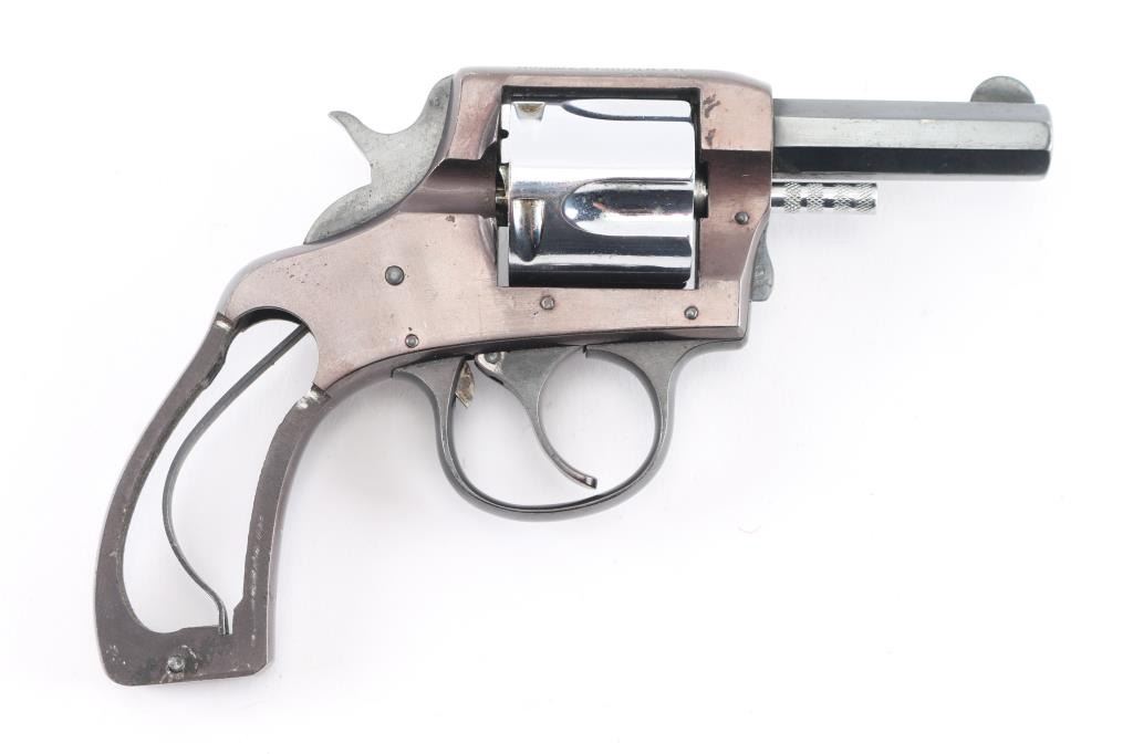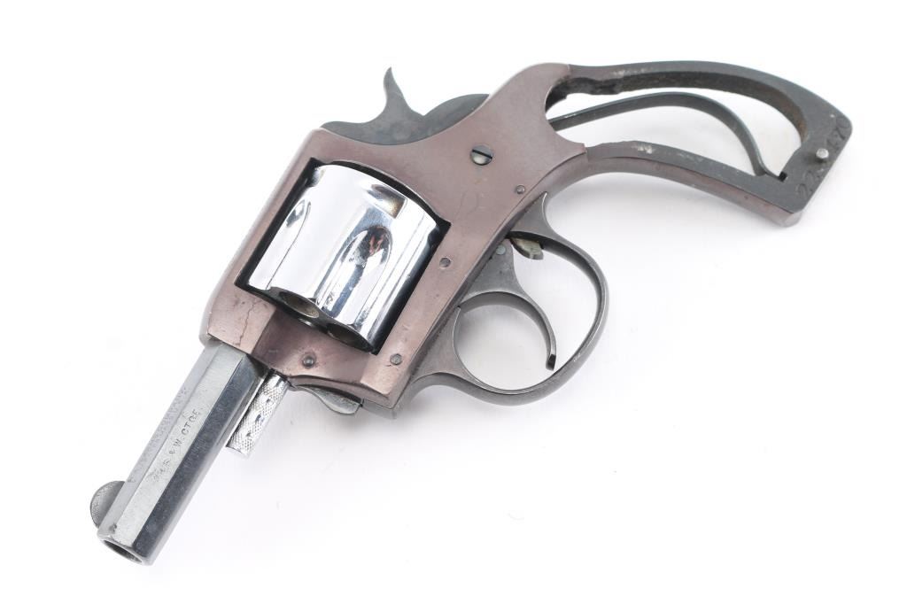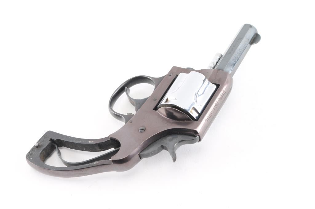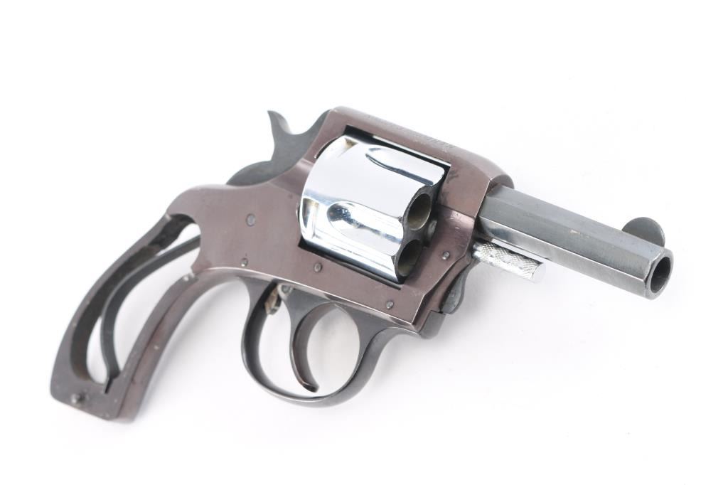 **For Parts or Repair Only - Cracked Frame** Vintage double action revolver has been reworked, has mix of blued and nickel parts, shows a fine crack across the barrel tennon on the left side of the frame. Missing grips, otherwise appears complete. Reblued with purple color on frame, nickel cylinder and center pin. Side loading round butt solid frame design, 2.4" octagon barrel, fixed sights, 5 shot fluted cylinder. Bore is fair to good. Metal surfaces show erosion of markings, loss of sharp edges from buffing, some small pits and other condition issues remain after refinish. The frame crack makes use of this frame unsafe, parts could be used to repair a different revolver, or this one used as a display only.