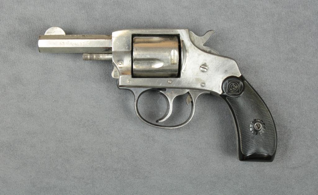 H & R Model 1905 DA revolver, .32 cal., 2-1/2” octagon barrel, nickel finish, checkered black hard rubber grips, #3. This gun is in overall good to very good condition showing approx. 40% original finish withbalance gone to a light patina showing cleaning to those surfaces, good action and bore, grips are good with an old chip out of the bottom of the right grip. Est.: $75-$150.