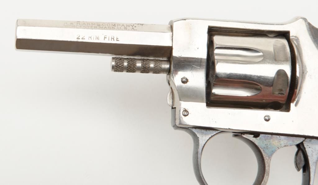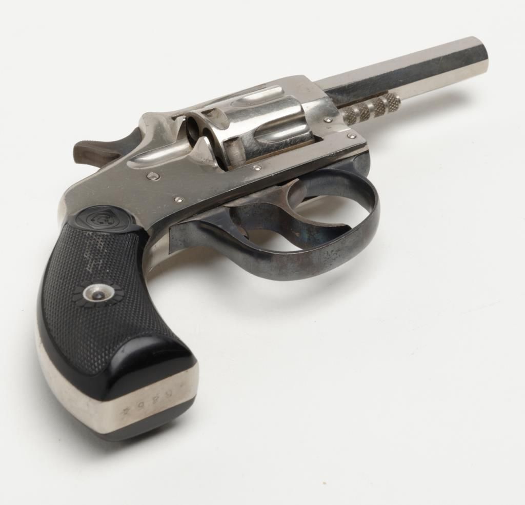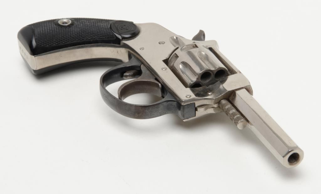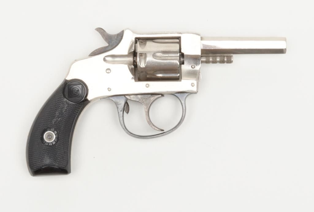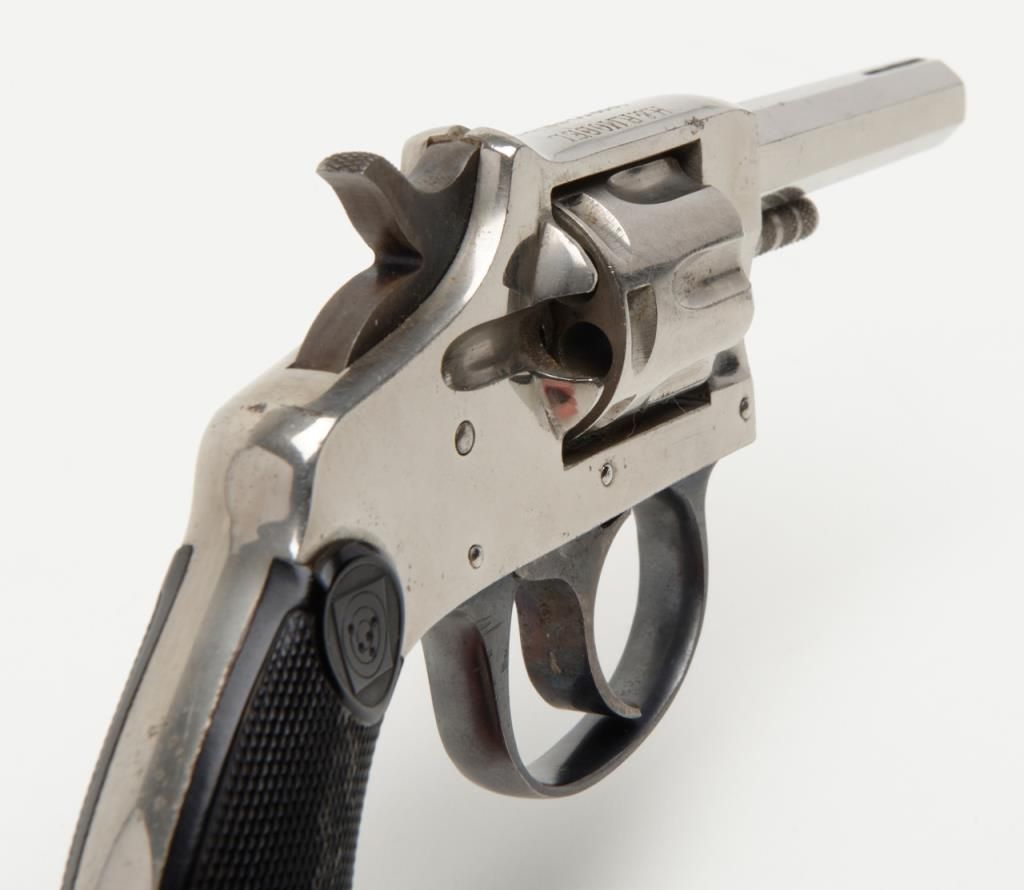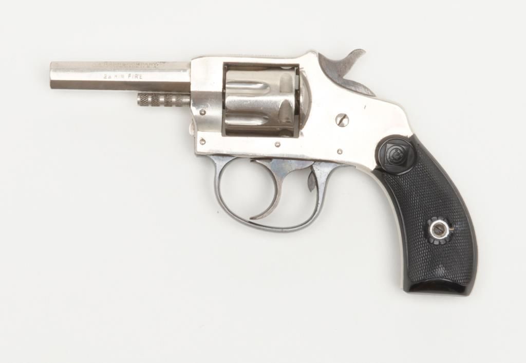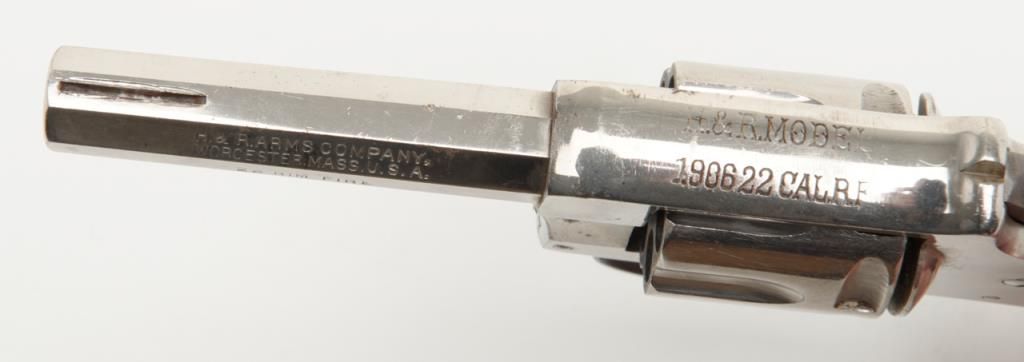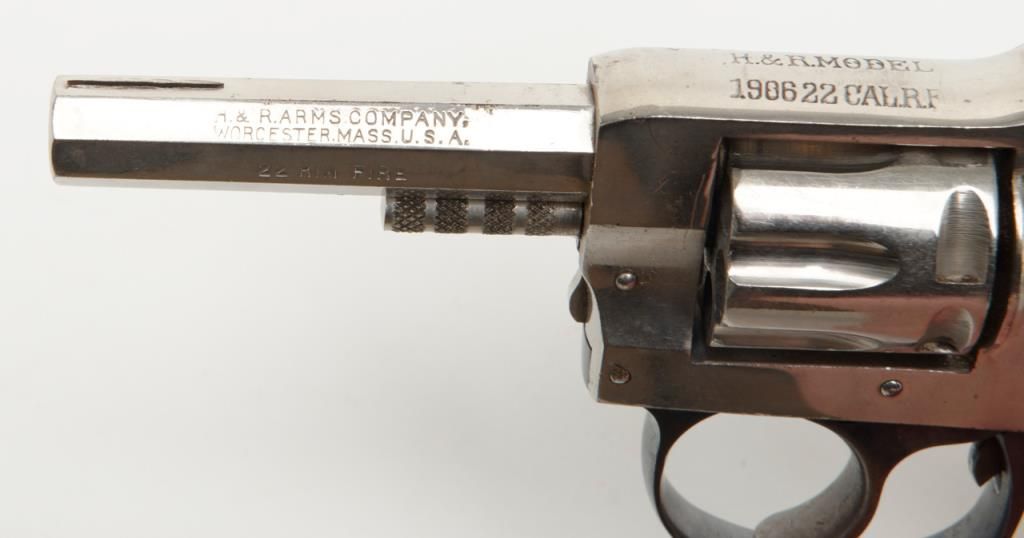 H&R Model 1906 DA revolver, .22RF cal., 2-1/2” octagon barrel, nickel finish, checkered hard rubber grips, #6354 in overall fine condition showing the majority of its original finish, crisp action, sharp markings, fine grips, very goodbore. (C&R). Est.: $150-$300.