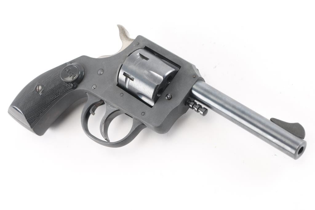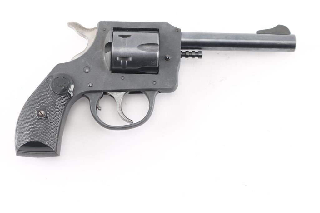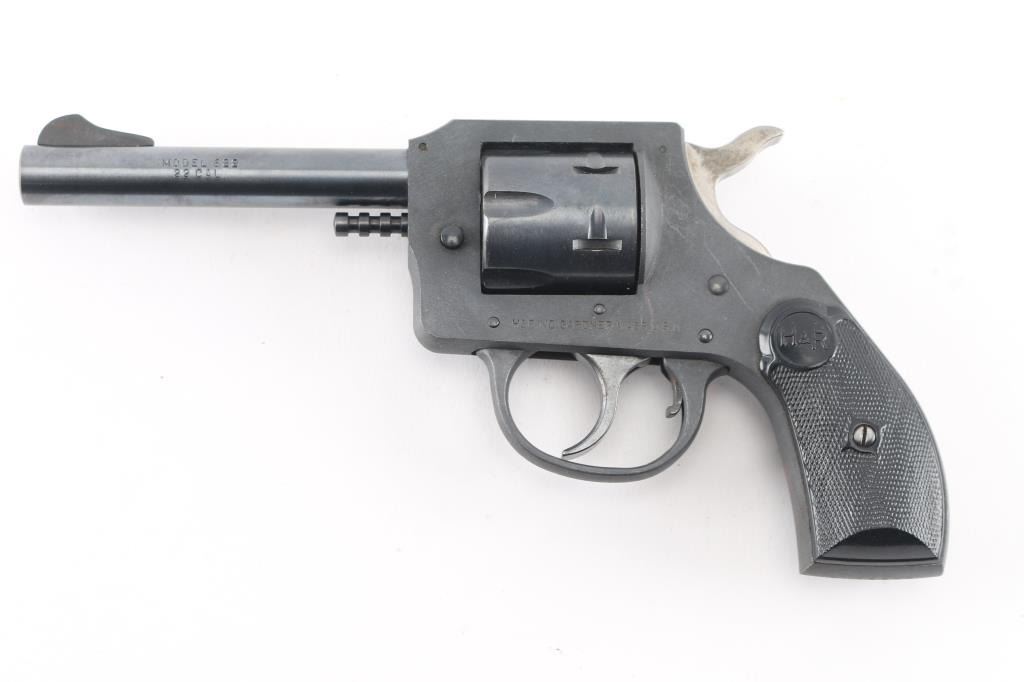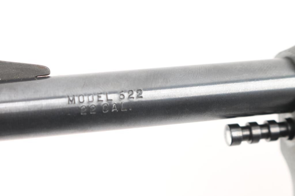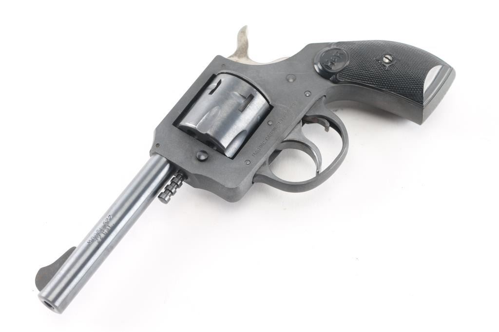 This is the Harrington & Richardson Model 622 revolver, manufactured in 1975. Pull-pin cylinder release. Blue barrel, and cylinder, parkerized frame, and triggerguard, 4" barrel, checkered black plastic grips with H&R monograms. Bore is excellent/bright, action is crisp, grips are excellent, finish is about 95% with minor scratches.