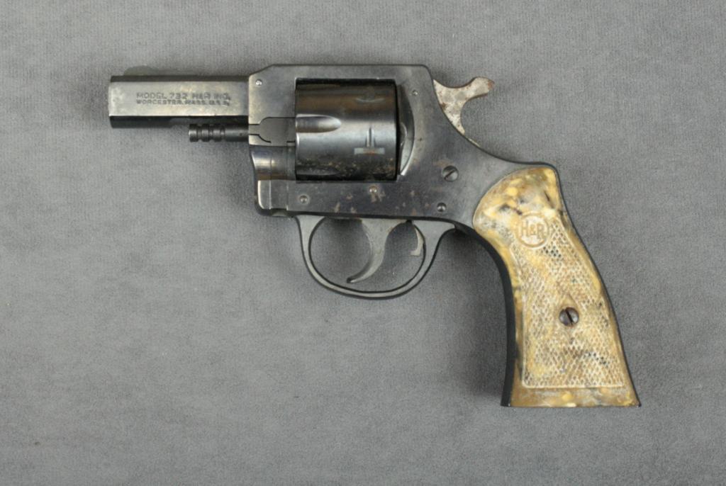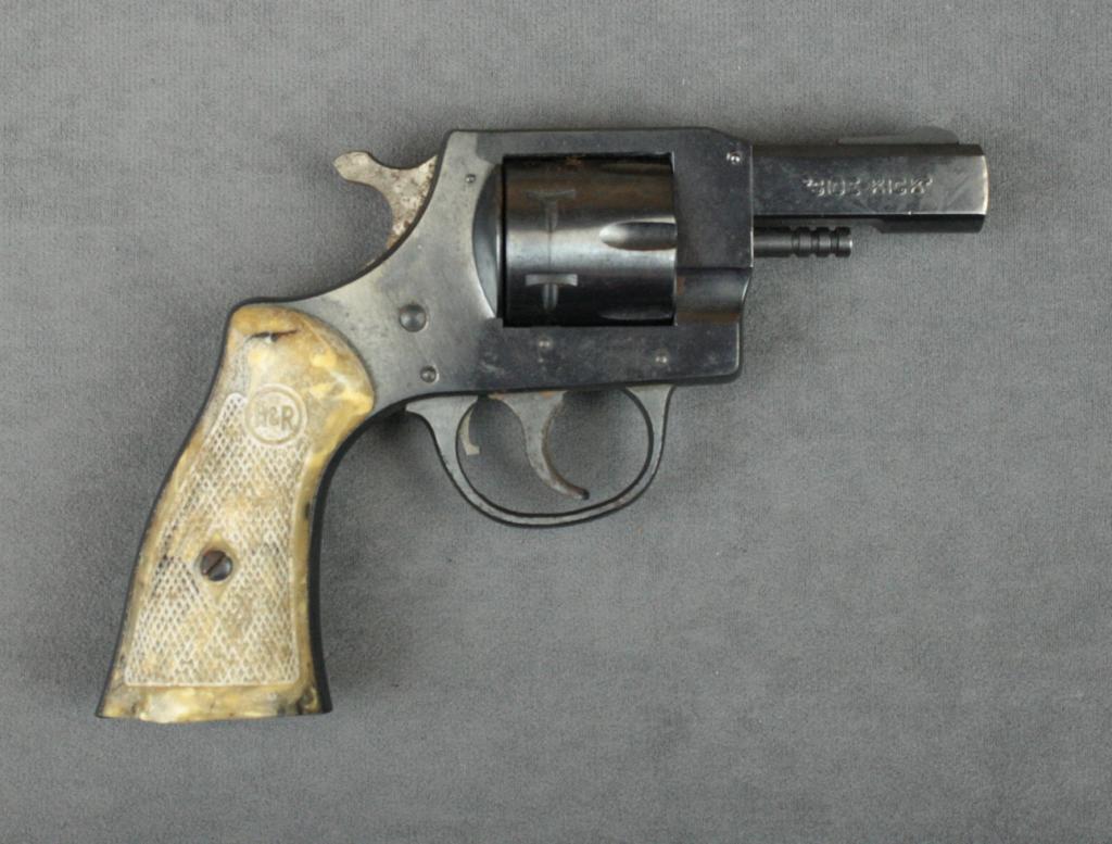 H&R Model 732 Side-kick DA revolver, .32  cal., 2-1/2” barrel, black finish, mottled  checkered H&R plastic grips, #U15455. This  gun is in overall good condition and can be  greatly improved with a careful cleaning andoiling; approx. 95% original finish remains  with some scattered spots of surface rust and  erosion; good action, bore, markings and  grips with slight damage to rear bottom of  left grip; accompanied with a Rosco brandbasketweave holster in fair condition.  Est.:   $50-$100.