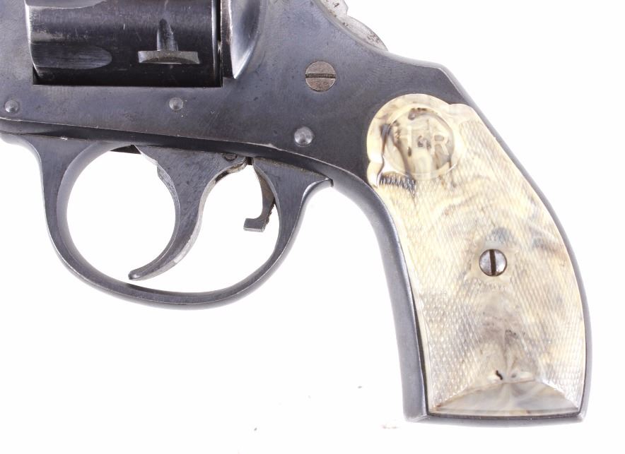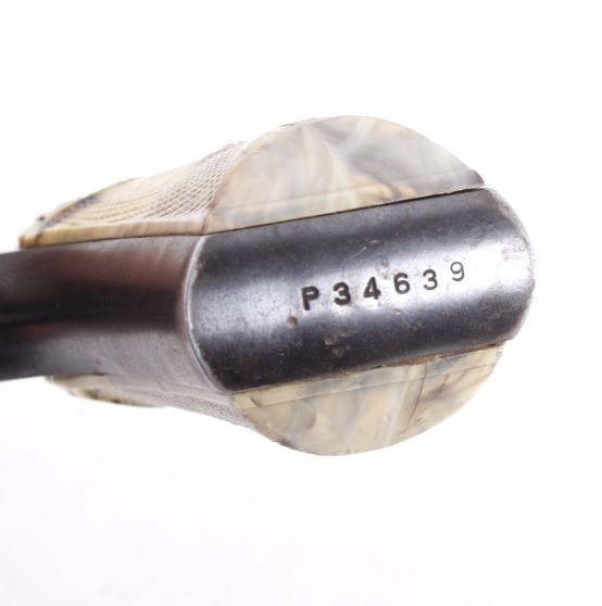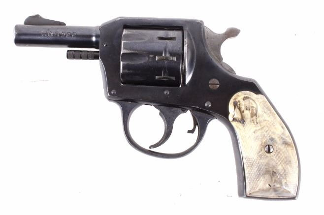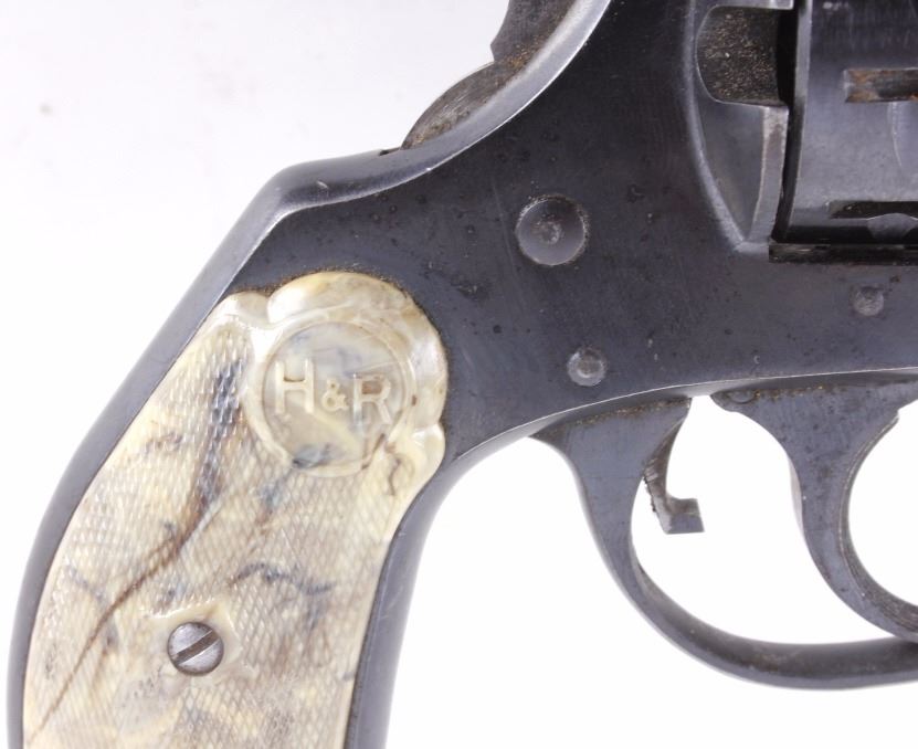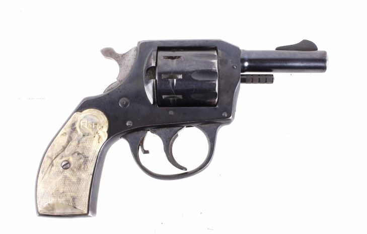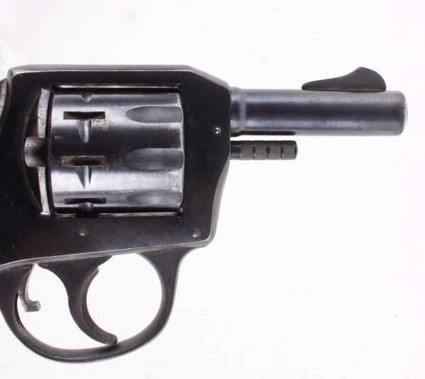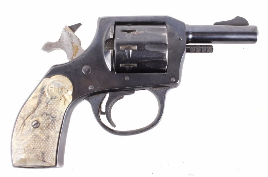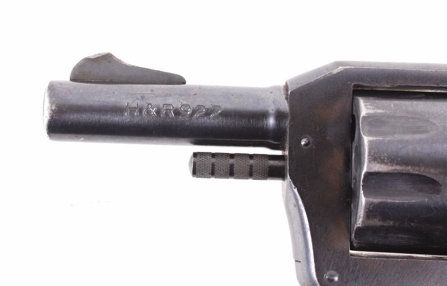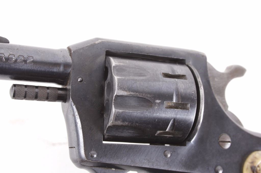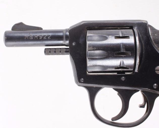 This lot features a prized H&R model 922 2 1/2" barrel revolver. Manufacture of the model 922 started in in 1927 and was offered with a 2.5", 4" and 6" barrel. Since then the popular 4 1/2" and 2 1/2" versions have been coveted by gun owners and collectors. This revolver is marked H&R 922 and the serial number includes the prefix P meaning it was built post 1940 when the company began adding letters to denote year manufactured. The revolver is very clean but does show holster wear on the cylinders. The revolver has its original issued grips. Overall the revolver is in good condition for its age and appears to be in working condition. Serial number: P34639 Curio and Relic revolver FFL or NICS background check required.
