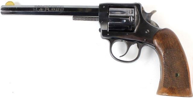 double action revolver, 6" barrel, blued finish, walnut checkered grips, 90-95% original finish. Modern. Est. 200-375