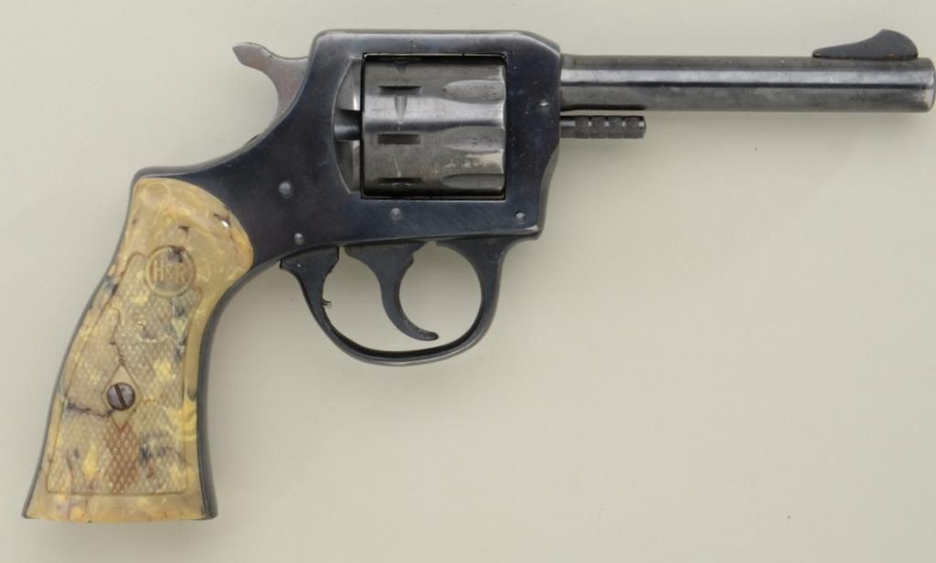 H&R Model 922 DA revolver, .22 cal., 4” barrel, blue finish, mottled colored checkered plastic grips, #N79003. This gun is in overall good condition showing considerable original finish, good bore,markings and grips; action needs adjustment; accompanied by an Idaho Leather Co. leather holster. Est.: $60-$120.