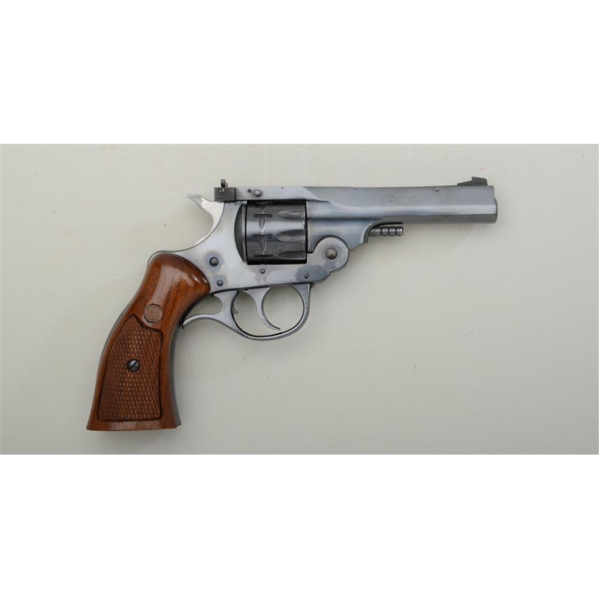 H&R Model 926 DA revolver, top break, .22LR cal., 4” barrel, blue finish, checkered wood medallion grips, #AT017452. This gun is in overall fine to excellent condition showing approx. 98% original finish with a couplespots of light erosion, fine bore, action, markings and grips. Est.: $125-$250.