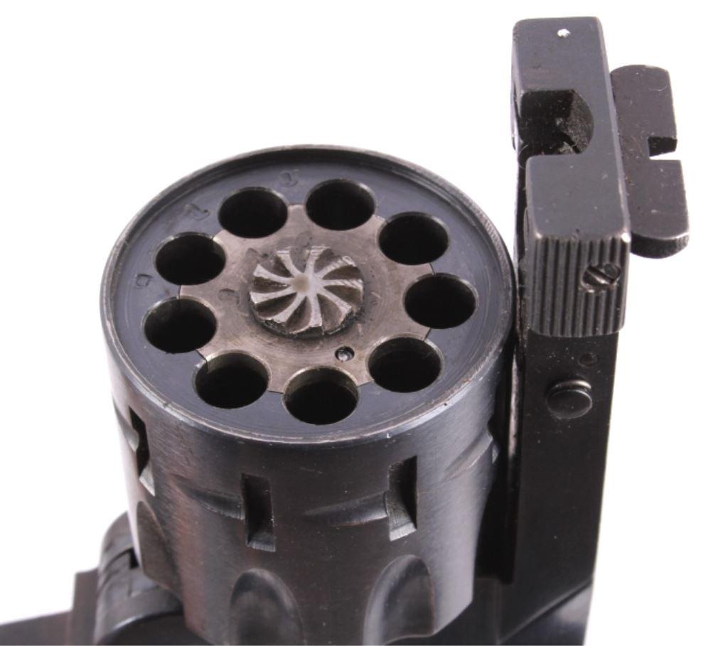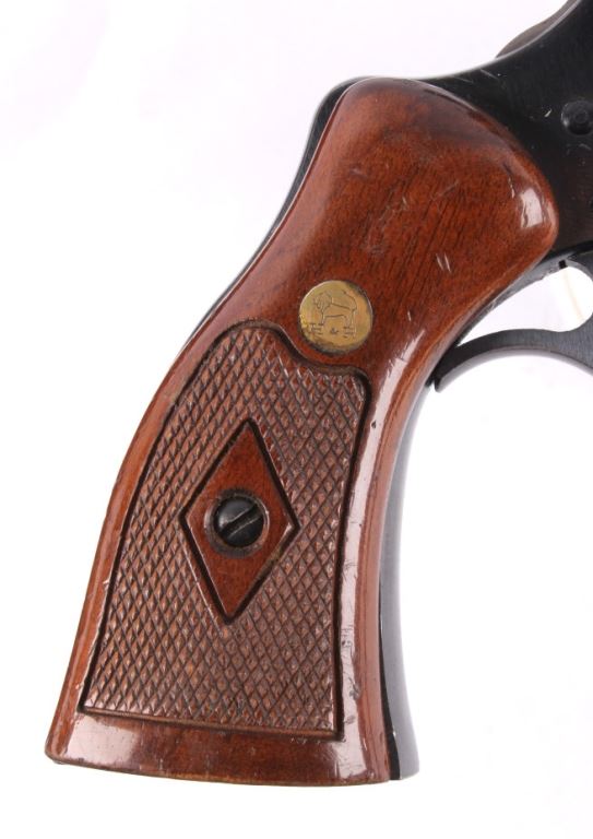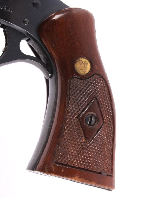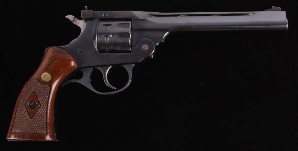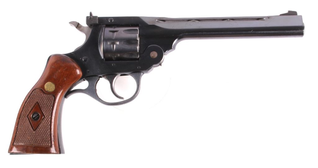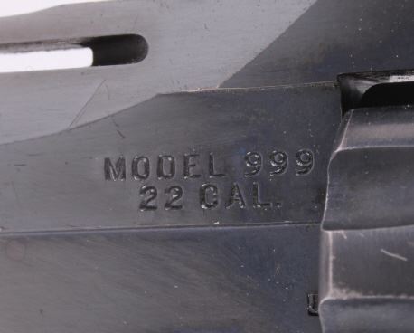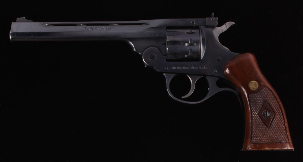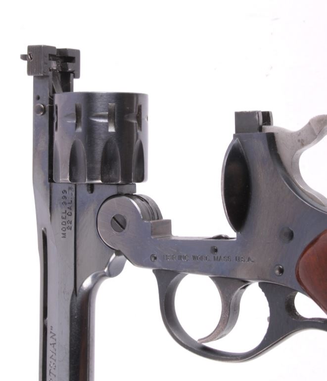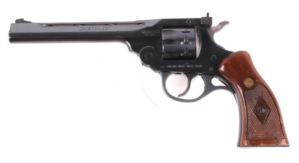 This is a H&R (Harrington and Richardson) Model 999 "Sportsman" double action nine shot .22 long, short, or long rifle revolver. The pistol has been discontinued for a quarter century, but is one of the most sought after .22 entry revolvers. This has a break over nine shot double action and can take any velocity of .22 ammunition with great accuracy. The hand gun has 99% of the original blue finish and the beautiful rare condition (also has original wood grips). H&R Inc. Worc. Mass. U.S.A. Works Flawlessly. Serial number AH72910.