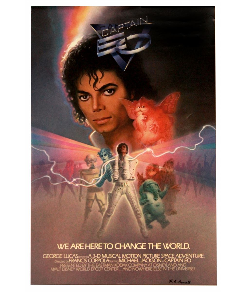 (Disneyland, 1986) Spectacular original artwork for the Captain EO attraction poster. Accomplished in Acrylic and gouache on Measuring 21.5 x 31.5 in. board, this is the only original Disneyland attraction poster artwork ever offered for sale. Opening in 1986, and running through 1996, the George Lucas produced attraction featured one of the first “4D” films, combining “3D” with live effects. The artwork is accompanied by a souvenir attraction poster signed by artist H.R. Russell. An amazing piece of contemporary Disneyland history.