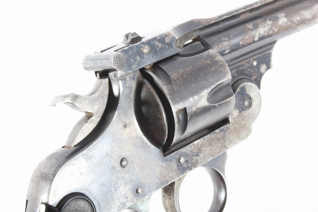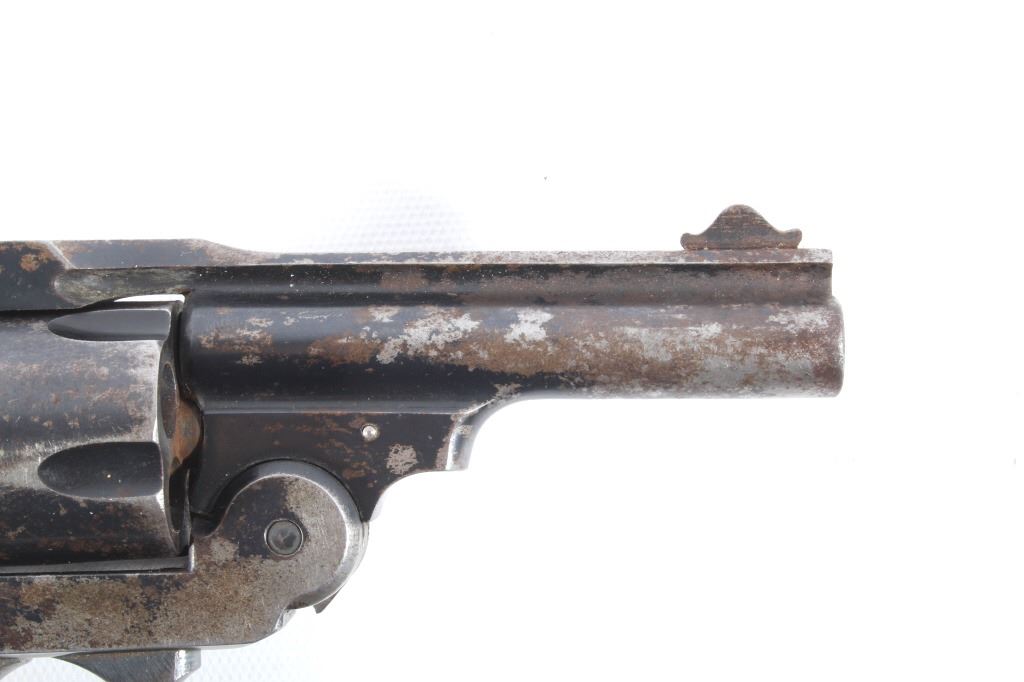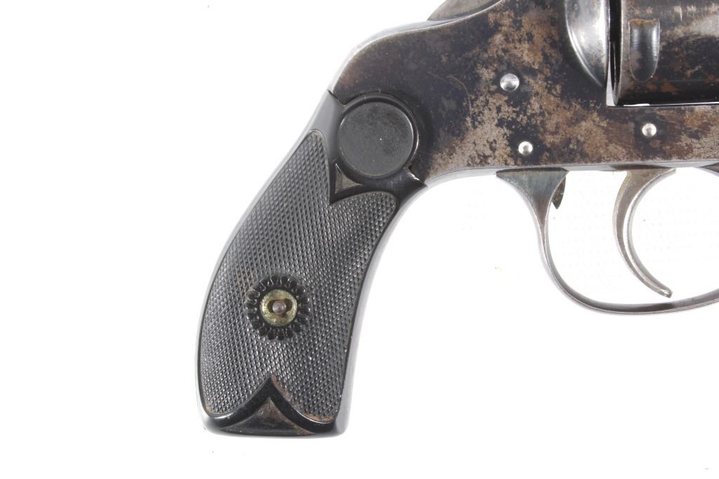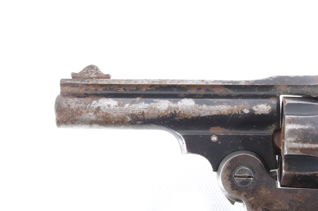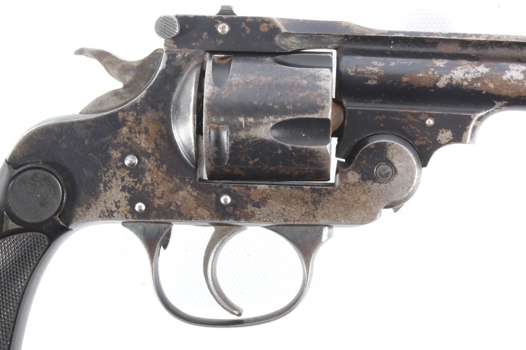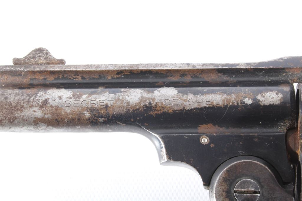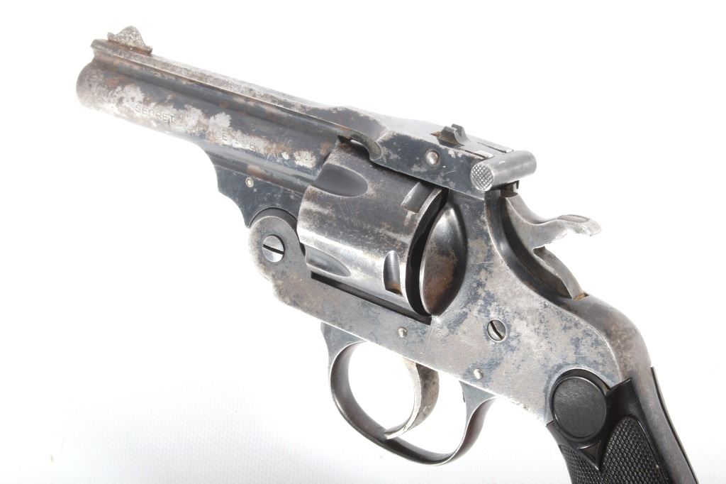This lot features a Harrington & Richardson Secret Service Special .38 Smith and Wesson Revolver. The revolver features a 2 1/4" barrel, 5 shot cylinder, hard rubber grips, top break action, and blue'd finish. The revolver is in good condition, with wear to finish and handling marks. The mechanics are functioning but stiff. The bore shows good condition, with fair rifling. This is a Curio & Relic firearm. FFL transfer or NICS background check required. The serial number is 183276