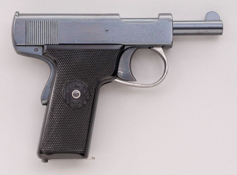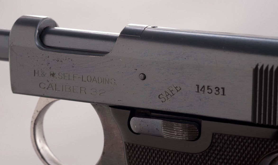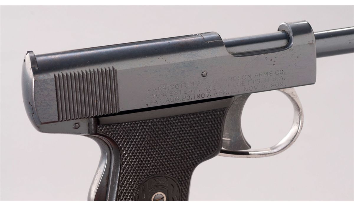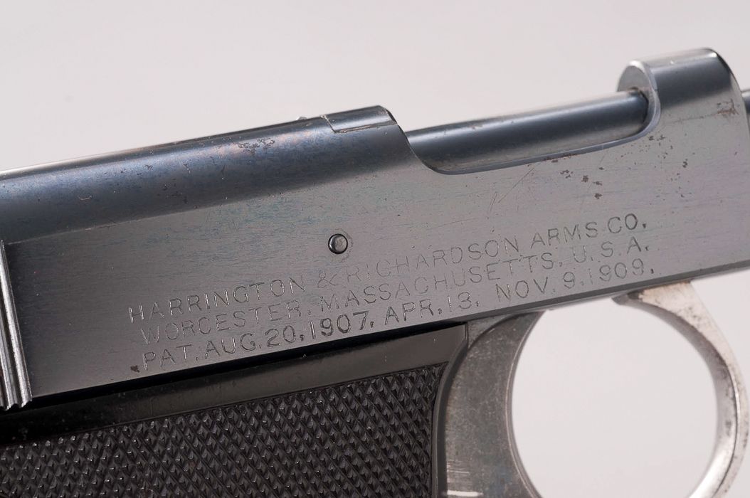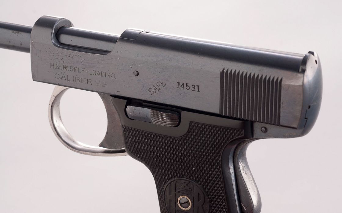Harrington & Richardson Self-Loading Semi-Automatic Pistol, #14531, .32 ACP cal., 3-1/2'' barrel, blue finish, bright triggerguard, H&R logo hard rubber grips, with one correct nickel-plated magazine. Mfg'd late 'teens. It is interesting to note that during the early years of WWII, H&R offered their remaining inventory of this type pistol in their 1939 and 1940 catalog. As this model was not sold in serial number sequence, it is difficult to tell if these pistols were shipped 1914-1924 or 1939-1940. Condition is excellent with just beginning light speckling to slide. Grips are crisp, action is tight, bore is bright. Est.: $350-$500. (C&R)