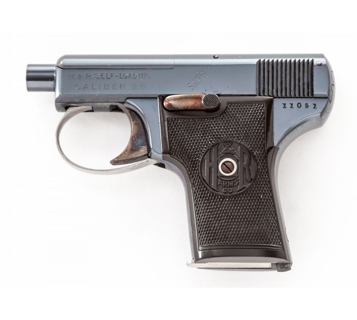Harrington & Richardson Self-Loading Semi-Automatic Pistol, #11091, .25 Auto cal., 2'' barrel, blue finish, factory checkered H&R hard rubber grips with logo. Condition is near excellent retaining approx. 98% original with minor scratch near safety. Grips remain crisp, as does action; bore is bright. Est.: $300-$500. (C&R)