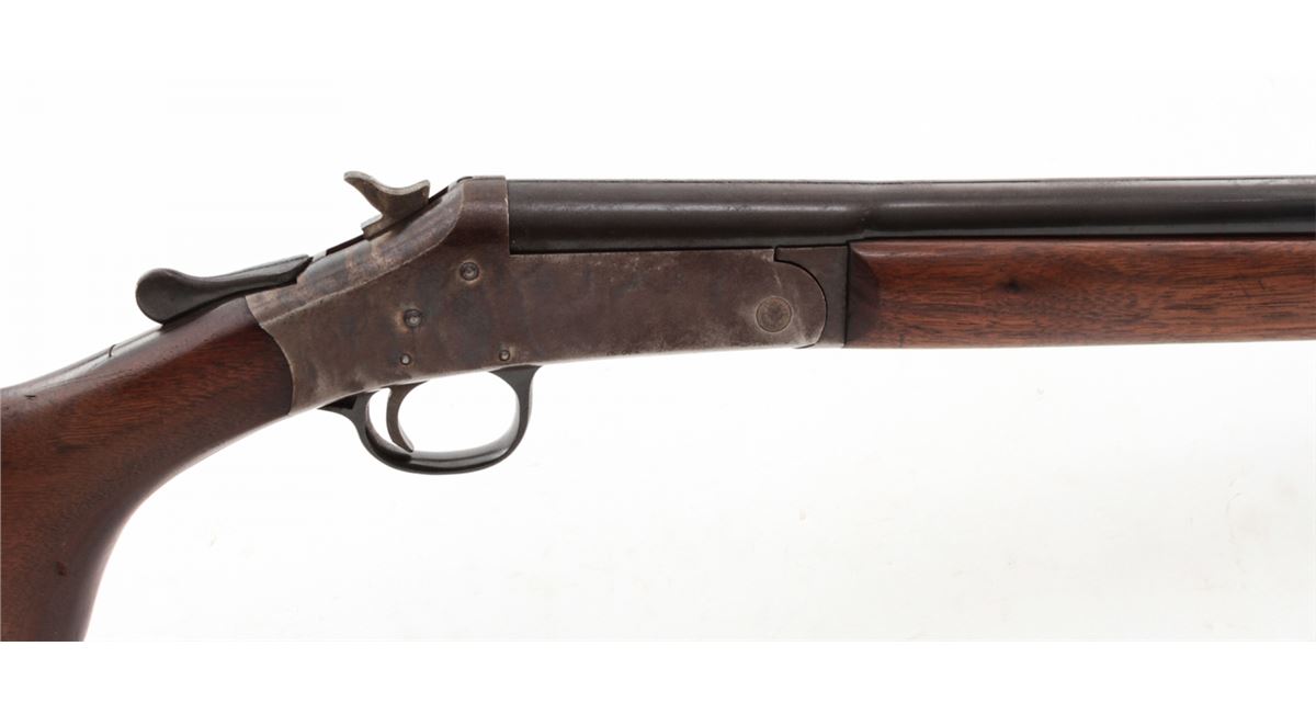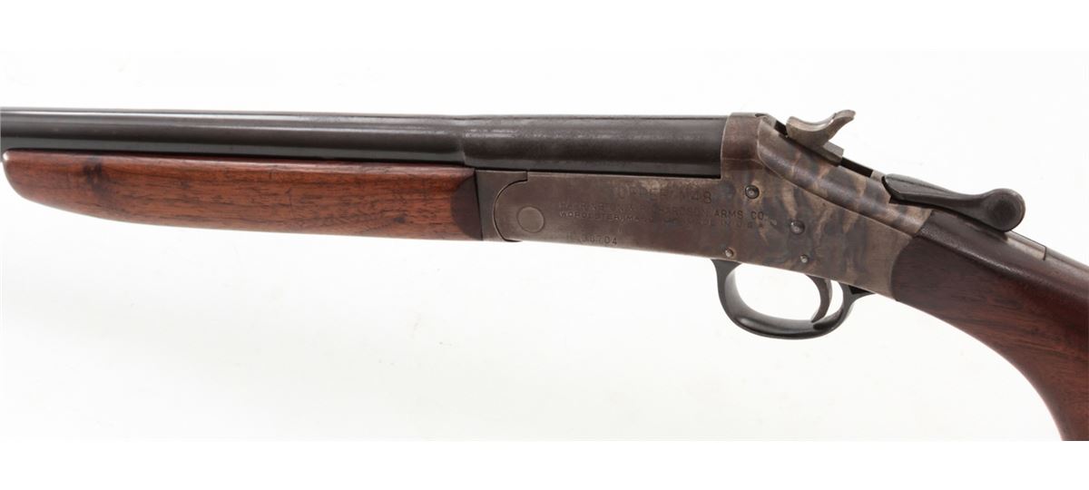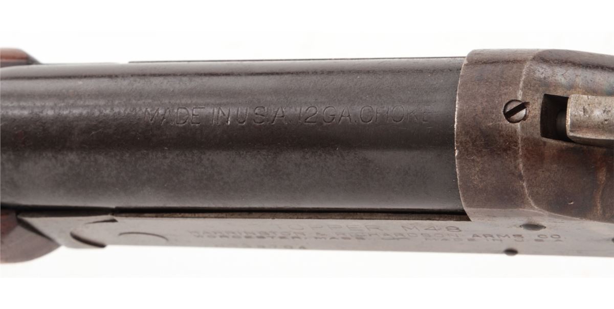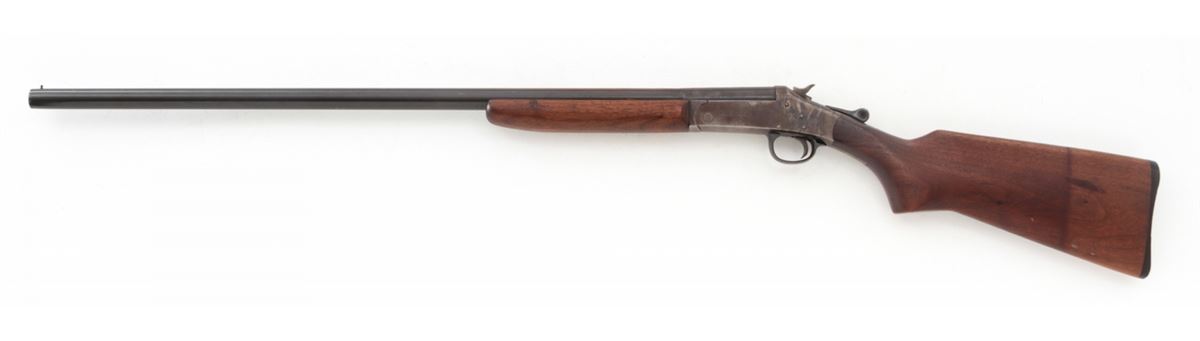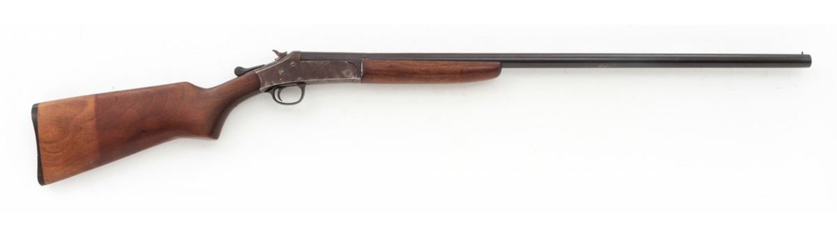 H&R Topper Model 48 Single Shot Shotgun, #H38704, 12 ga., 30'' blue barrel, case hardened frame, walnut stock. Condition is about fine. Barrel retains approx. 95% lightly thinning and toning blue. Case hardened frame with 50% finish. Stock with light marks from handling and some discoloration near butt from old sleeve rubber butt pad. Action remains crisp, bore is bright. Est.: $150-$300. (C&R)