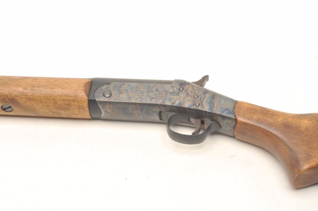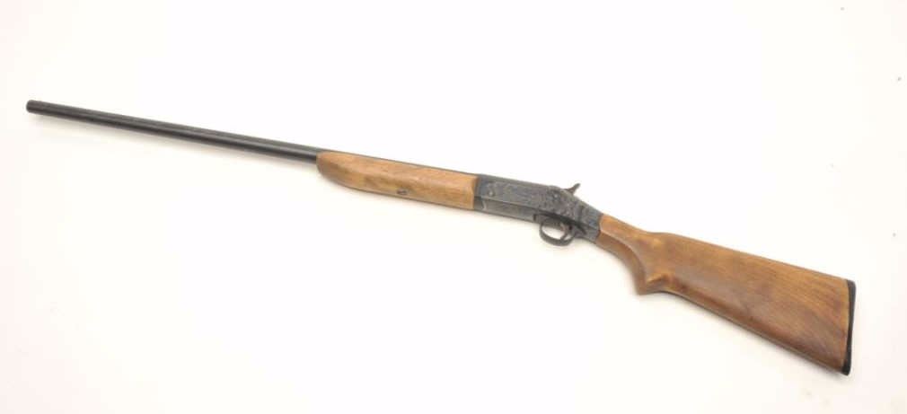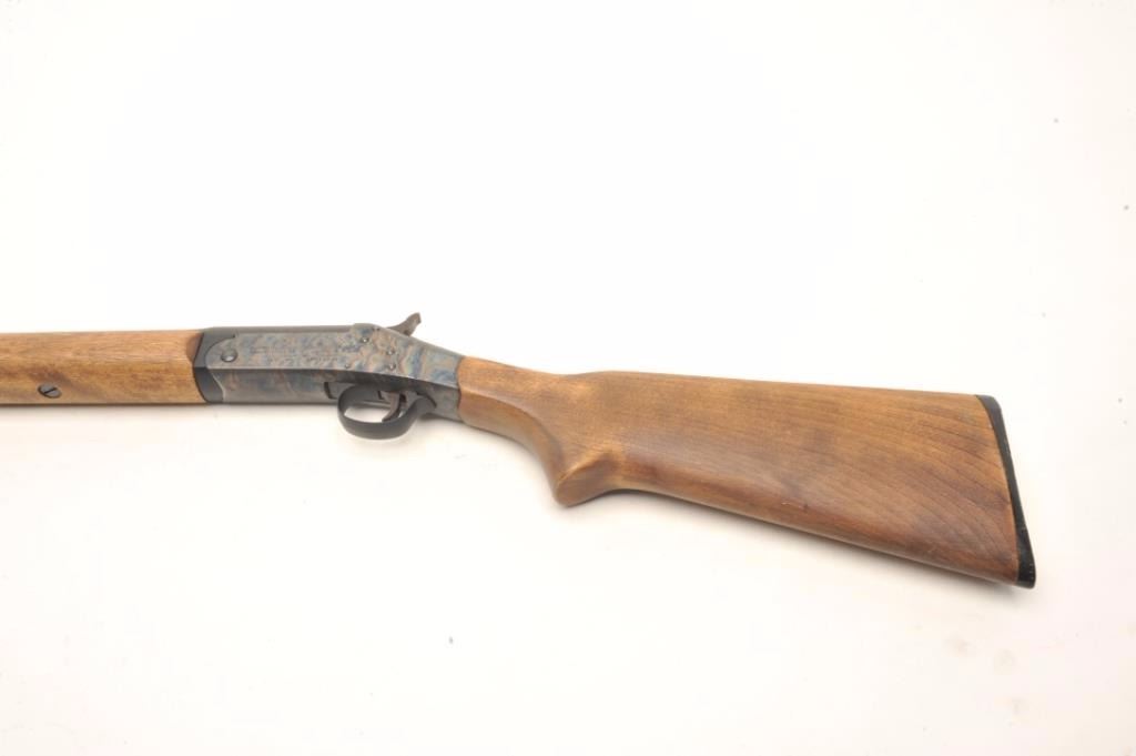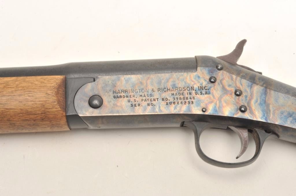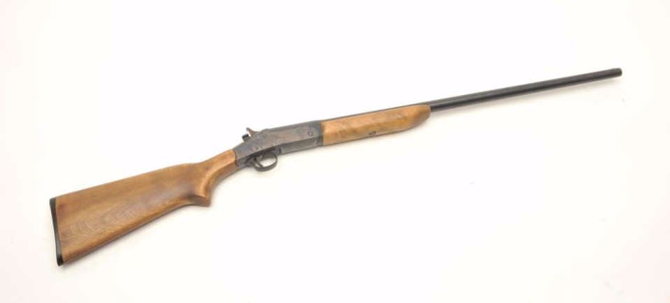 H & R Topper Model 58 single shot shotgun, 20 gauge, serial #AUG46233. The shotgun is in good overall condition with a 28” barrel with brass bead front sight. The barrel retains the majority of its muted blued finish whilethe receiver shows beautiful case hardening. The smooth wood stocks are in good condition with a hard plastic butt plate and 13 ¾” LOP. The bore is good, the action crisp and the markings are sharp. Est.: $75-$150.