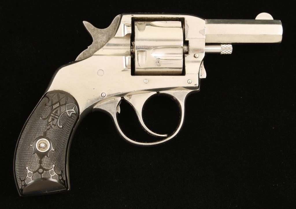 Nickel plated double-action 5-shot revolver with a 2" barrel. Finish is 95% or better with only a few spots of rust through the plating. The bore and chambers are shiny with good rifling. Function is good and tight. The hard rubber grips are complete and immaculate. Condition is very good. *Modern Firearm*