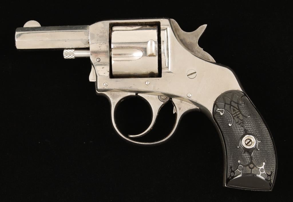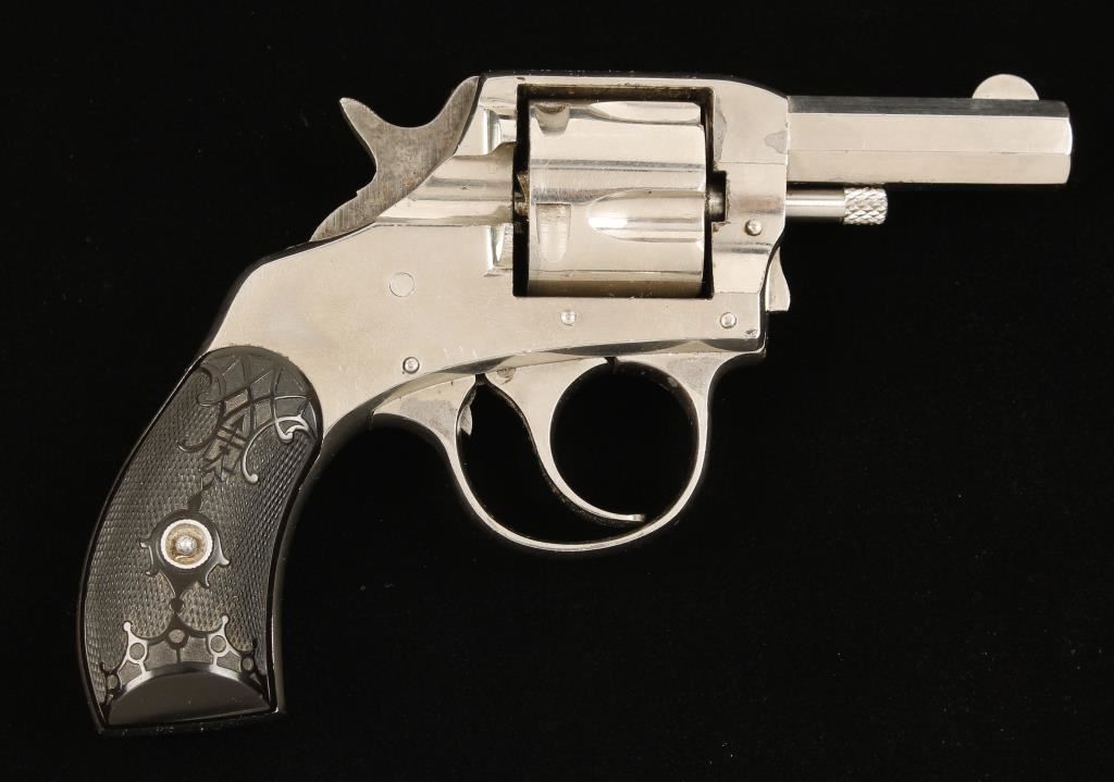 Nickel plated double-action 5-shot revolver with a 2" barrel. Finish is 95% or better with only a few spots of rust through the plating. The bore and chambers are shiny with good rifling. Function is good and tight. The hard rubber grips are complete and immaculate. Condition is very good. *Modern Firearm*