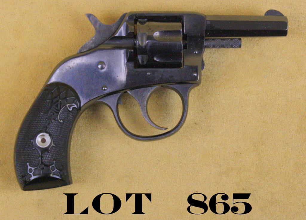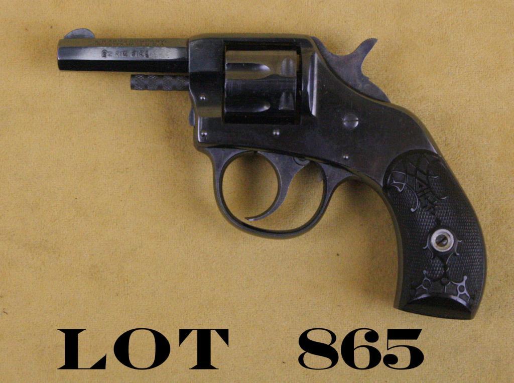 H & R Young American Model DA pocket revolver, .22 RF cal., 2” octagon barrel, blue finish,, checkered black hard rubber grips #104244. This gun is in overall excellent condition showing little use orhandling, just some starting pin prick erosion on the right side of the frame; accompanied by a Harrington & Richardson cardboard box that is not for this gun but for a top break H&R; box has been repairedand needs further conservation. Est.: $150-$250.