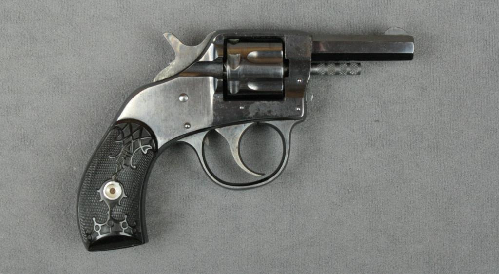 H & R Young American Model DA pocket  revolver, .22 RF cal., 2” octagon barrel,  blue finish,, checkered black hard rubber  grips #104244. This gun is in overall  excellent condition showing little use orhandling, just some starting pin prick  erosion on the right side of the frame;  accompanied by a Harrington & Richardson  cardboard box that is not for this gun but  for a top break H&R; box has been repairedand needs further conservation.  Est.:   $150-$250.