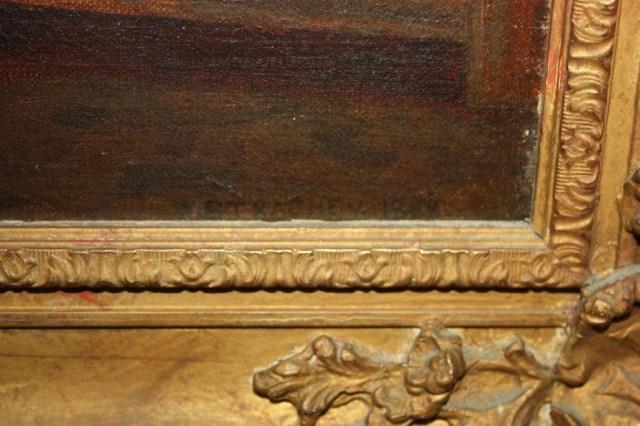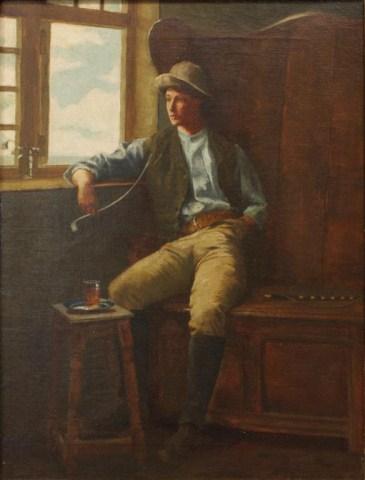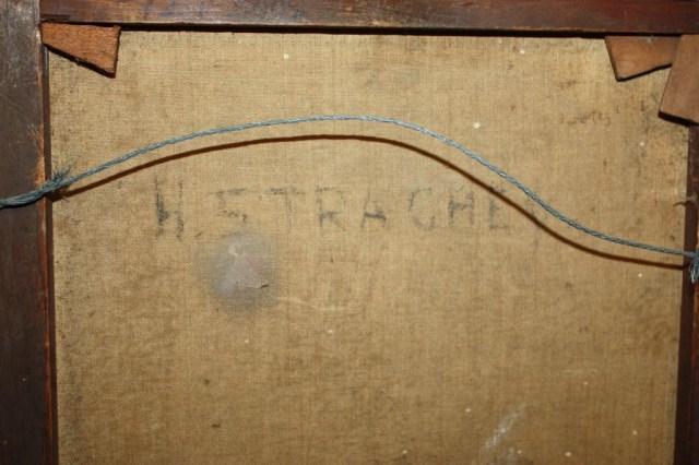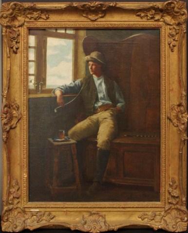H. Strachey (British 1863-?) Oil Painting on Canvas depicts young man with pipe sitting on a bench near a window. Signed lower right and dated 1888. Measures 18 1/2" h X 14 3/8" w + 2 1/2" matte & frame.