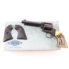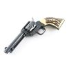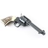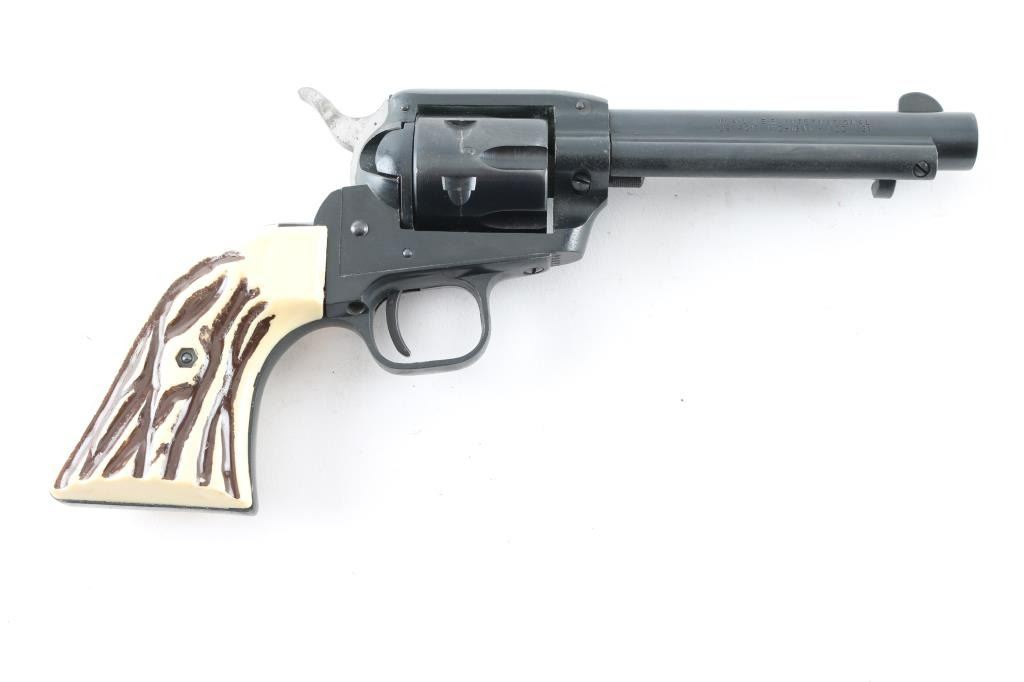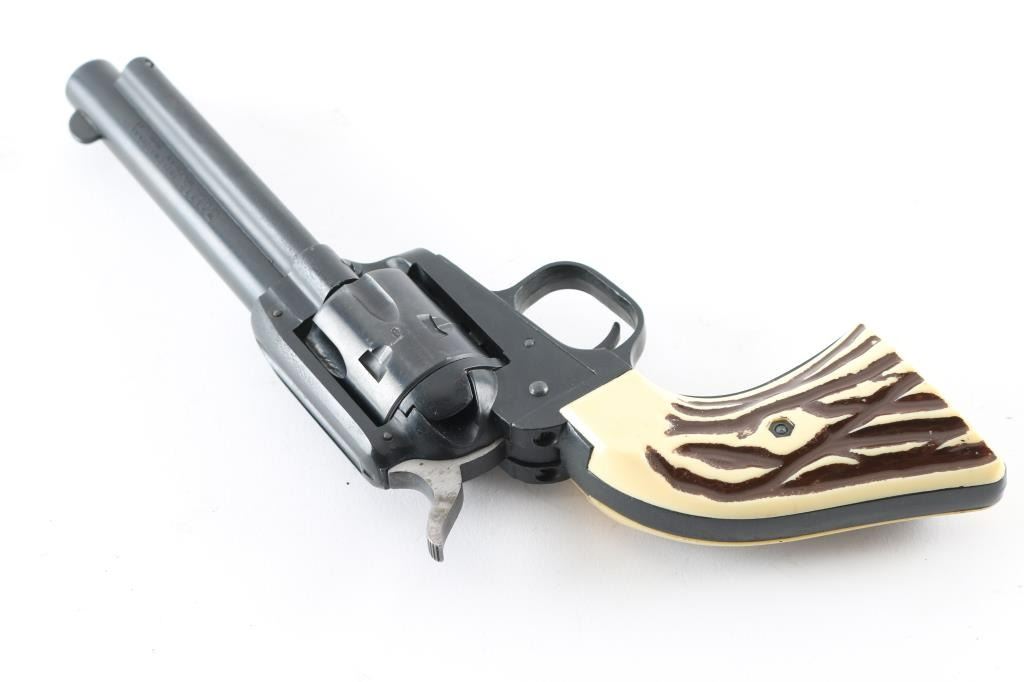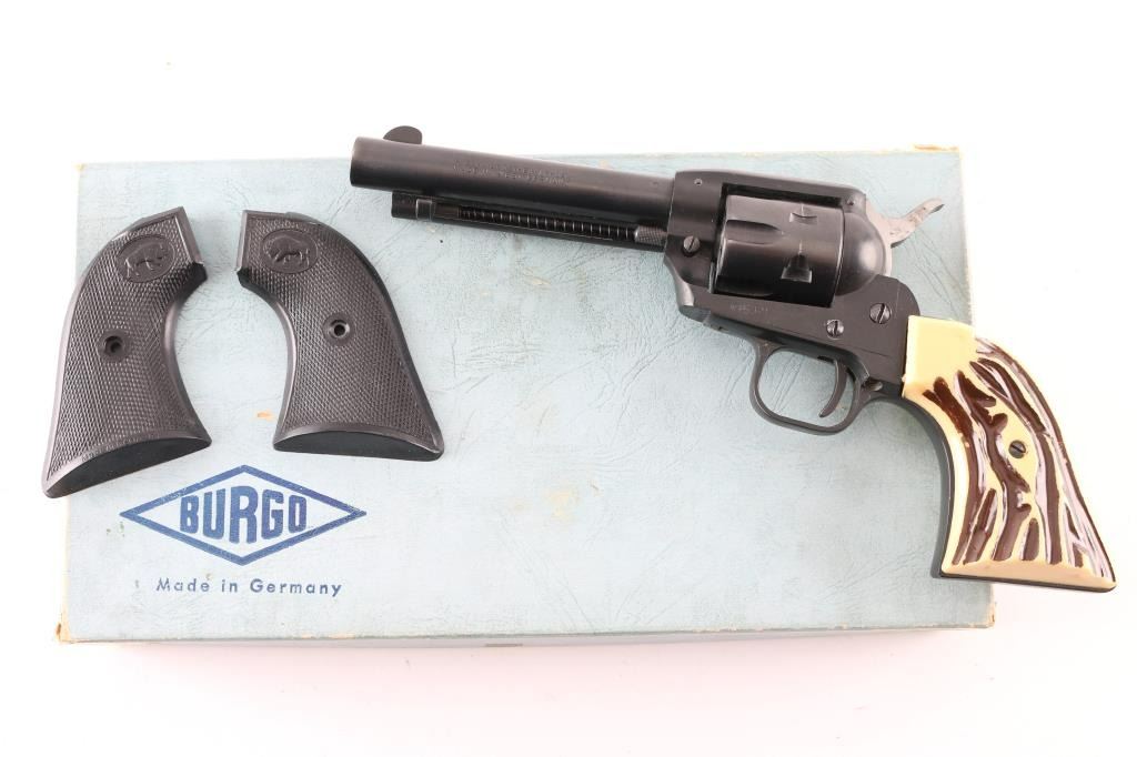 SN: 498612 Economic western style single action revolver chambered in .22 Long Rifle, manufactured in West Germany, dated 1969. Imported by Walker International, Detroit MI, with import marks on the right side of the barrel. Features blued/black finish, 4.75" barrel, fixed sights, smooth trigger, serrated hammer spur, fluted six-shot cylinder, ejector rod, two-piece polymer faux stag grips, spare set of checkered black plastic grips with molded bison decor. Bore is very good. Retains 80% finish, full coverage, tiny raised bumps on right side of frame and on ejector rod housing appear to be under the finish (on aluminum or zinc alloy parts). Grips are very good. Includes "BURGO" marked box with fitted foam interior (foam in poor shape). Condition is NRA Very Good *** Modern Firearm ***
